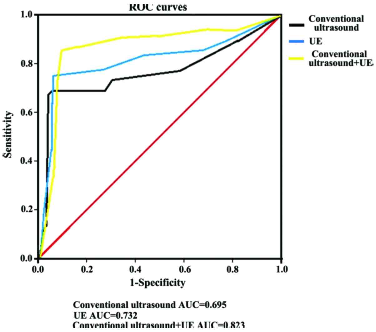 The application value of conventional ultrasound and ultrasonic elastography (UE) in preoperative diagnosis and combined diagnosis of malignant anus neoplasms was investigated. One hundred and twenty patients, whose mass was detected by digital rectal examination, were examined using UE and conventional ultrasound before operation, and the results were compared with those of histopathological examinations after operation, so that the accuracy and imaging features of UE as well as UE combined with conventional ultrasound in diagnosing malignant anus neoplasm were analyzed. Among the 120 patients, 77 were diagnosed with benign lesions and 43 were diagnosed with malignant lesions via pathological diagnosis for anal canal lesion surgery. Conventional ultrasound before operation showed that 53 patients were diagnosed with benign lesions and 26 with malignant lesions. Compared with that in the pathological diagnosis results, the diagnostic accordance rate in preoperative conventional ultrasound was 65.8%. Through UE diagnosis, 66 patients had benign lesions and 39 patients had malignant lesions. Compared with that in the pathological diagnosis results, the diagnostic accordance rate in preoperative UE was 87.5%. After the examination via UE combined with conventional ultrasound before operation, 71 patients were diagnosed with benign lesions and 40 patients were diagnosed with malignant lesions; compared with that in the pathological diagnosis results, the diagnostic accordance rate was 92.5%. In terms of mass qualitative diagnosis, the sensitivity and specificity of conventional ultrasound were 60.5 and 68.8%, respectively; those of UE were 90.7 and 85.7%, respectively, and those of UE combined with conventional ultrasound were 93.0 and 92.2%, respectively. According to the analysis results of receiver operating characteristic (ROC) curve, the area under curve (AUC) of malignant anus neoplasm diagnosed via UE was 0.732 [95% confidence interval (95% CI), 0.211‑2.534], the AUC via conventional ultrasound was 0.695 (95% CI, 0.517-0.932), and that via UE combined with conventional ultrasound was 0.823 (95% CI, 0.146‑4.643). In conclusion, examinations utilizing UE combined with conventional ultrasound can increase the preoperative diagnostic accordance rate in malignant anus neoplasm, which can be used as an effective method for preoperative diagnosis of malignant anus neoplasm.