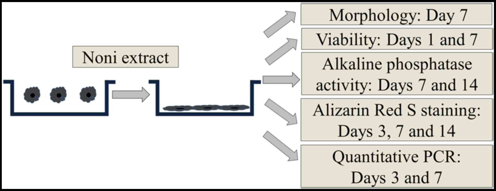 In conclusion, the results of the present study demonstrated that treatment with noni extract improved cellular viability and increased osteogenic differentiation. Based on current literature and the results presented here, noni extract may have beneficial effects on dental mesenchymal stem cells by strengthening the cellular viability and osteogenic differentiation. These findings may lead to the discovery of potential natural agents for chronic periodontitis, which may provide clinical benefits for bone regeneration in patients with periodontitis.