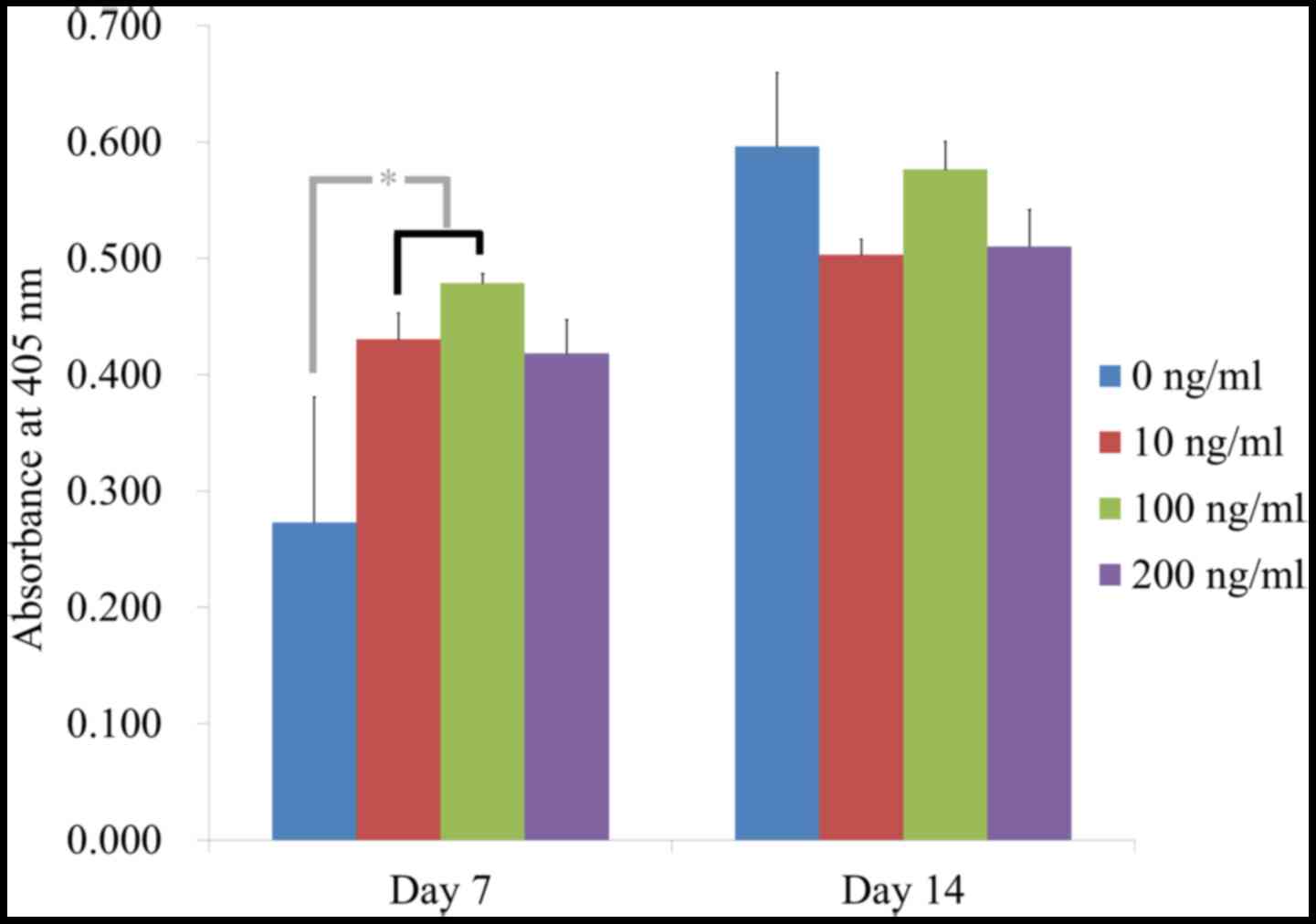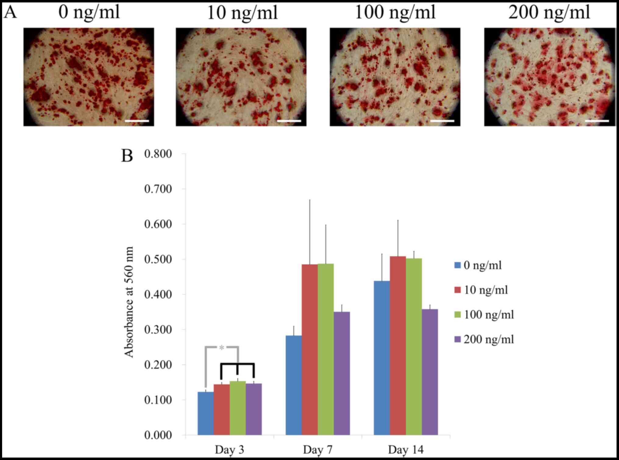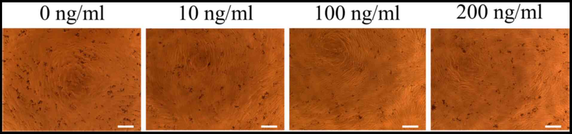 Significantly higher values for alkaline phosphatase activity were observed in the 10 and 100 ng/ml groups on day 7, with the highest value at 100 ng/ml (P<0.05; Fig. 4).