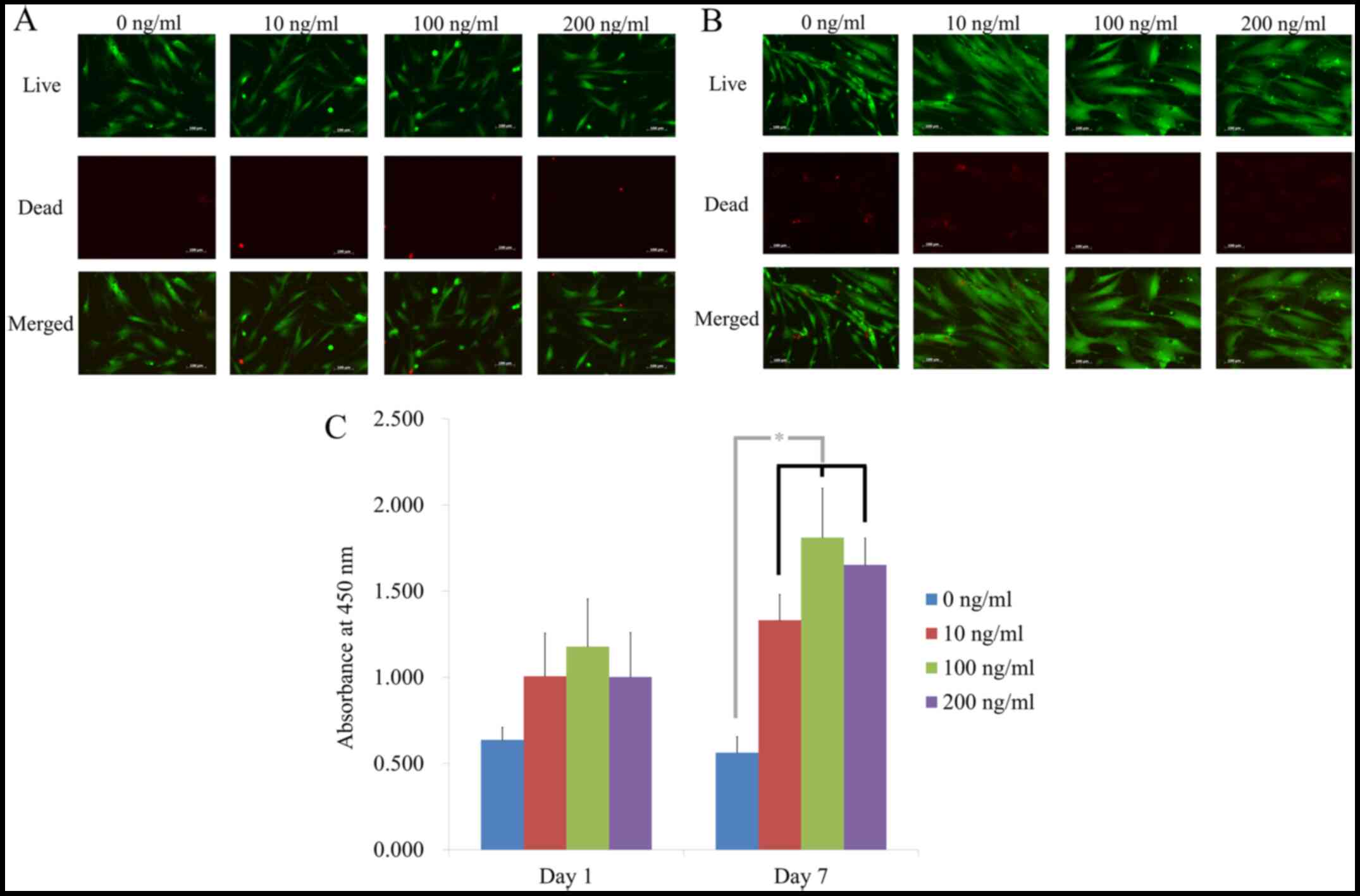 Qualitative analysis of cellular viability was performed on days 1 and 7 via the commercially available two-color assay (Live/Dead Kit assay, Molecular Probes; Thermo Fisher Scientific, Inc.), which determines both the plasma membrane integrity and esterase activity (15). Quantitative analysis of viable cells was performed via the Cell Counting Kit-8 assay (Dojindo Laboratories, Inc.), where absorbance was measured at 450 nm, using a spectrophotometer (BioTek Instruments, Inc.). Cells were incubated at room temperature for 1 h.