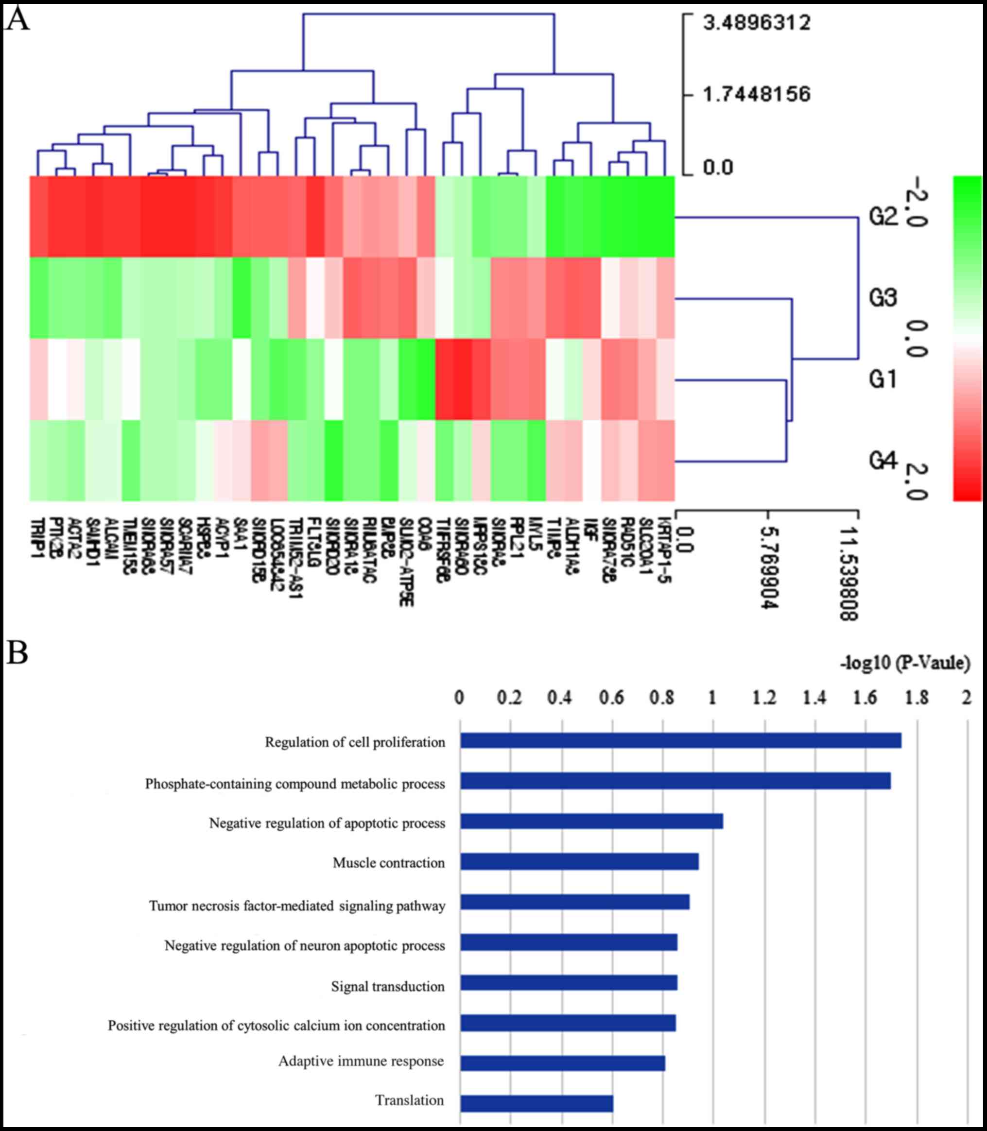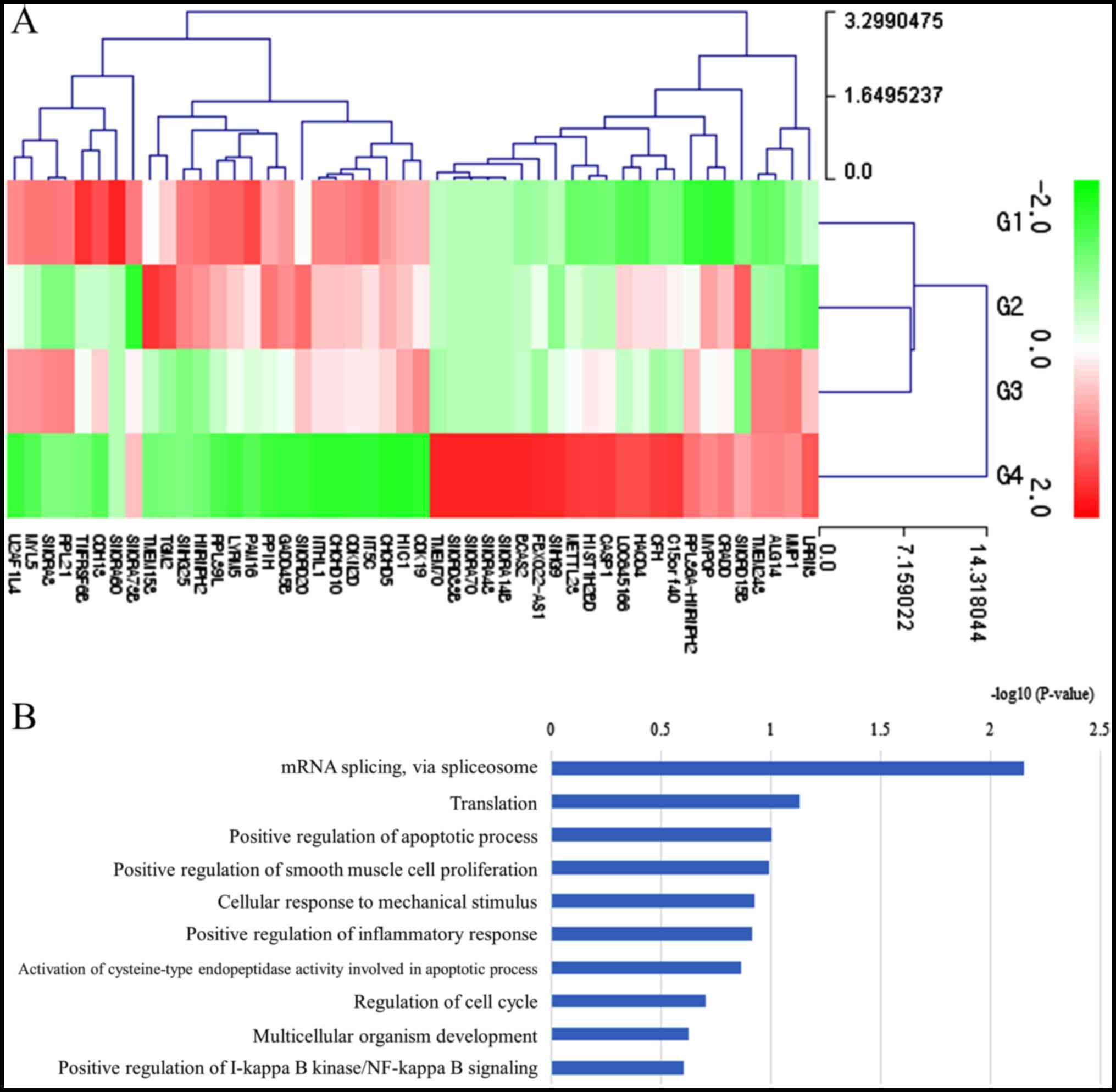 Differentially expressed mRNAs in the 10 ng/ml group vs. the control group are presented in Table SI (fold change >1.5 and log3 normalized read counts >3 were selected). Comparison of the 10 ng/ml group vs. the control group revealed that 22 mRNAs were upregulated and 13 were downregulated. Clustering analysis of the differentially expressed mRNAs is presented in Fig. 6A. Bar charts depicting the top Gene Ontology terms are presented in Fig. 6B. The most highly associated pathway was ‘regulation of cell proliferation’.