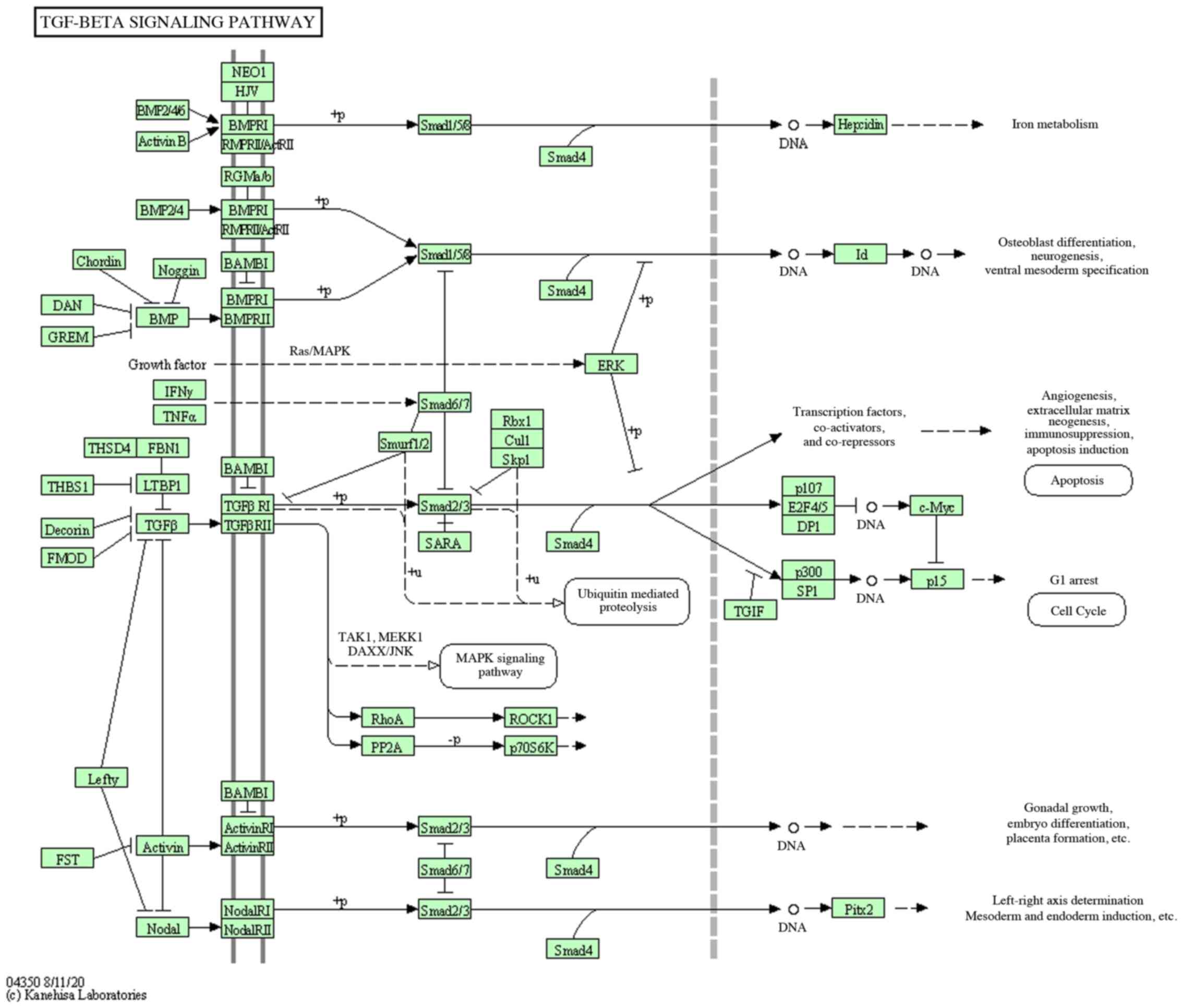 Differentially expressed mRNAs in the 200 ng/ml group vs. the control group are presented in Table SIII (fold change >1.5 and log2 normalized read counts >3 were selected). Comparison of the 200 ng/ml group vs. the control group revealed that 23 mRNAs were upregulated and 25 were downregulated. Clustering analysis of the differentially expressed mRNAs is presented in Fig. 8A. Bar charts depicting the top gene ontology terms are presented in Fig. 8B. The most highly associated pathways were ‘mRNA splication’ and ‘translation’. The signaling pathway associated with the target genes was transforming growth factor-β (TGF-β) pathway (Fig. 9).