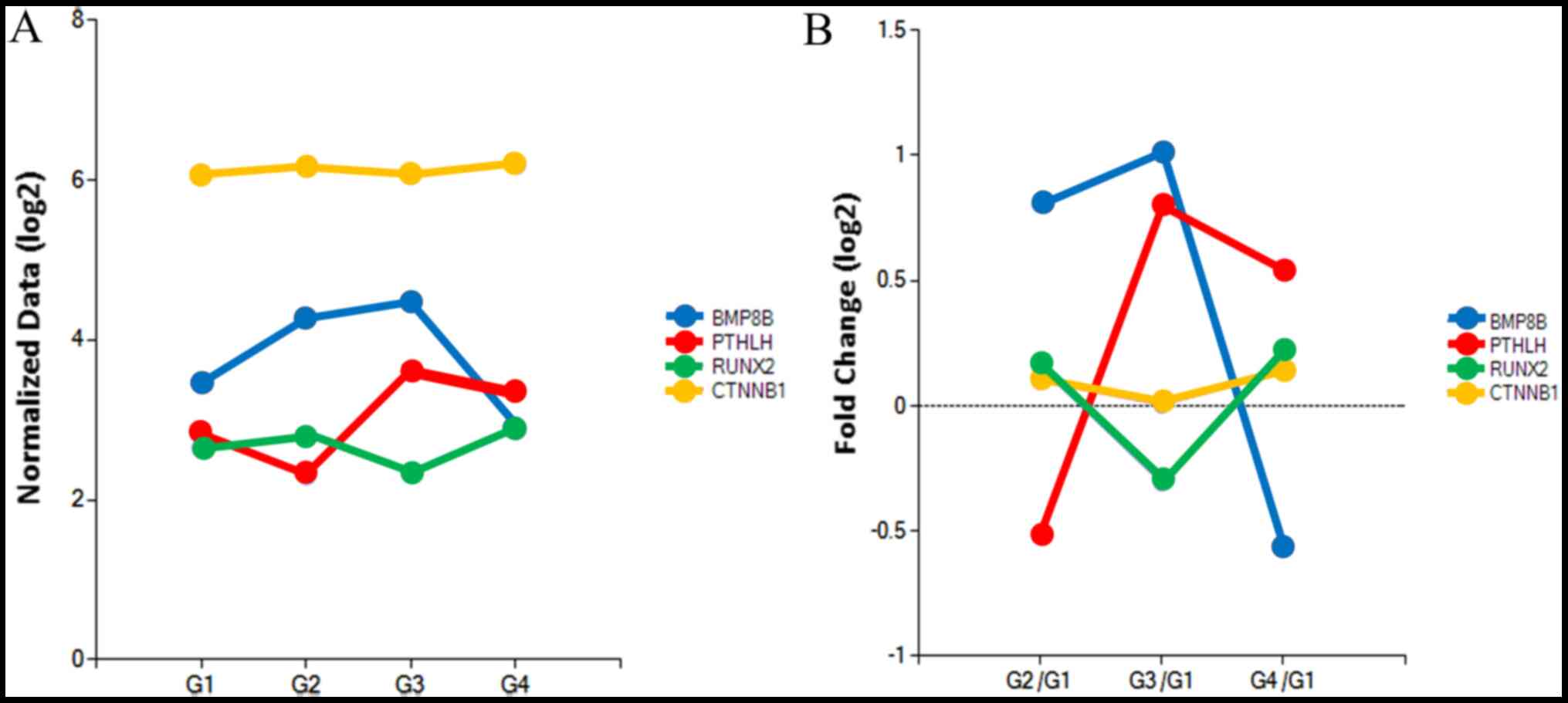 Evaluation of RUNX2, BSP, OCN and COL1A1 mRNA expression levels via qPCR in osteogenic media