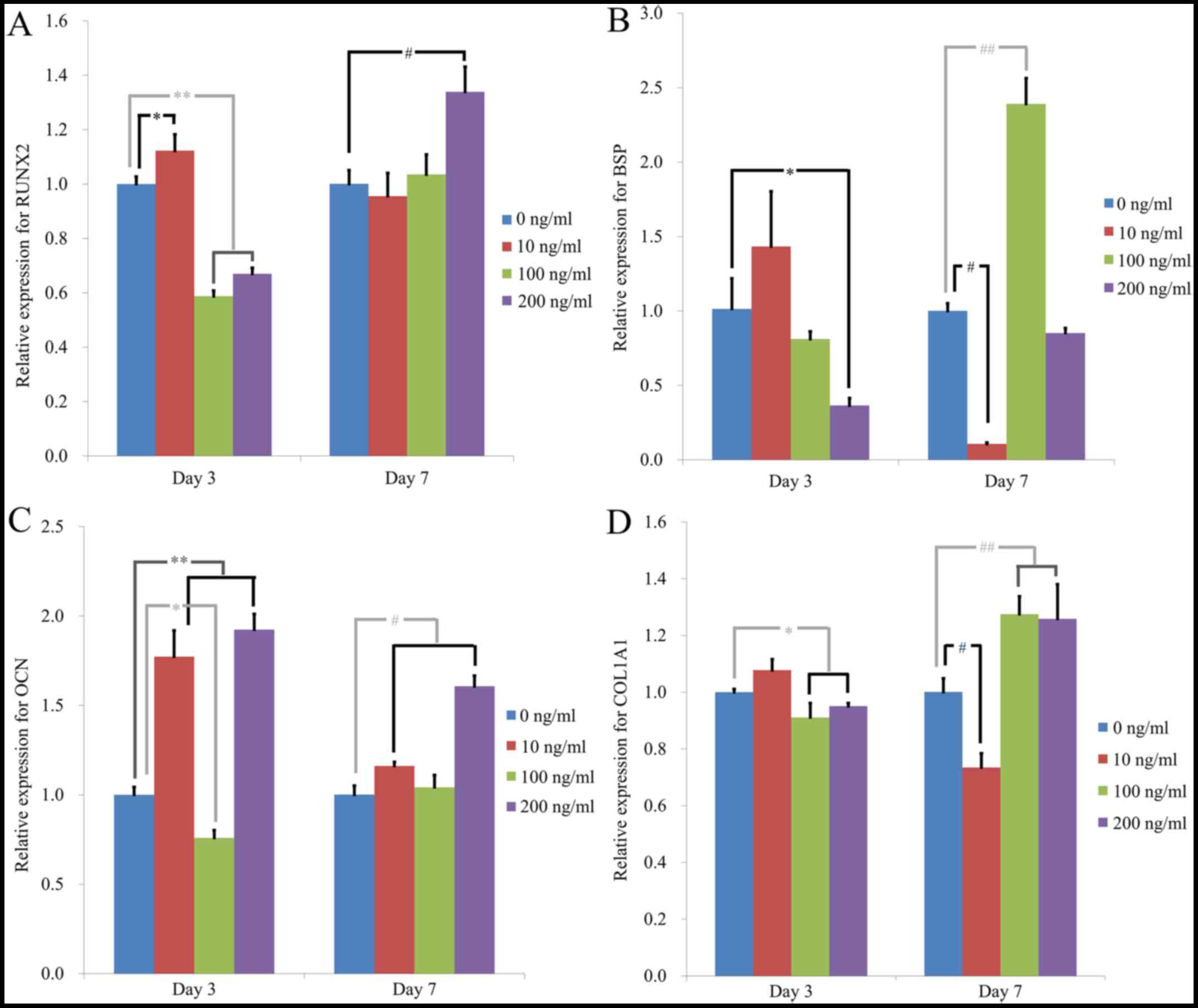 Quantification of RUNX2, BSP, OCN and COL1A1 mRNA expression levels via quantitative (q)PCR