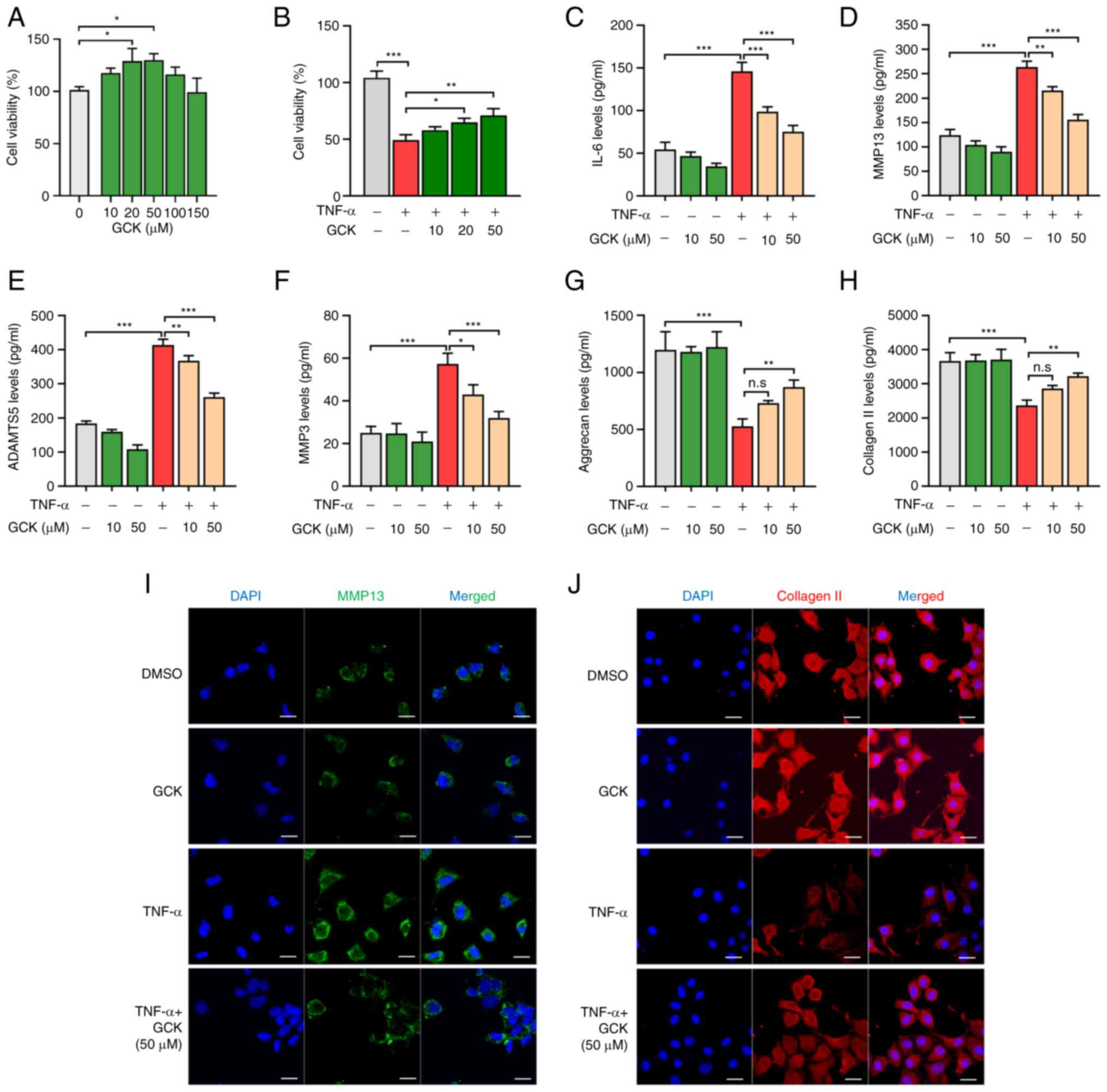 In addition, the viability of PMCs was found to be significantly reduced by TNF-α treatment. However, co-treatment with GCK (20 and 50 µM) significantly restored their cell viability (Fig. 1B). To assess the influence of GCK on TNF-α-induced inflammation and ECM dysregulation, the secretion of ECM regulatory factors were measured using ELISA. The results indicated that TNF-α induced a significant increase in IL-6, MMP13, ADAMTS5 and MMP3 levels (Fig. 1C-F), whilst significantly decreasing aggrecan and collagen II levels (Fig. 1G and H). GCK appeared to have reversed these alterations in a dose-dependent manner (Fig. 1C-H). Immunofluorescence staining also revealed that GCK partially suppressed the MMP13 expression that was induced by TNF-α whilst rescuing the collagen II expression that was reduced by TNF-α in PMCs (Fig. 1I and J).