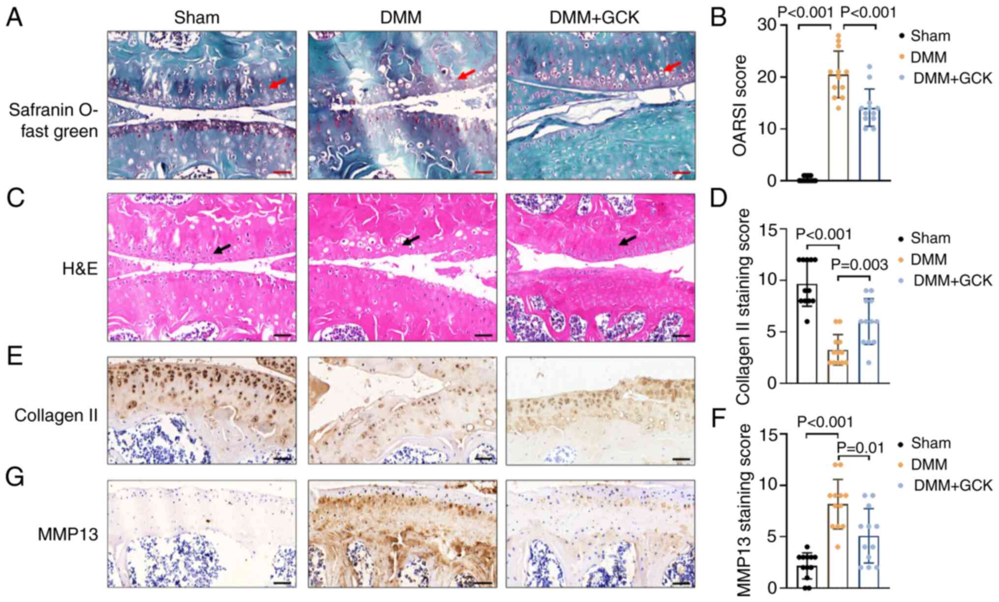Data are presented as the mean ± SD. Statistical analysis was conducted using GraphPad Prism 8.10 (GraphPad Software; Dotmatics). The Wilcoxon's signed-rank test was performed for Sham vs. DMM comparisons due to the paired nature of these two groups, whilst the Wilcoxon's rank-sum test was performed for DMM vs. DMM + GCK comparisons due to the unpaired nature of these two groups. Bonferroni's correction was conducted on all P-values yielded by these two aforementioned tests. Since two tests were performed within each group, P<0.025 was considered to indicate a statistically significant difference in these two cases. Either Kruskal-Wallis test followed by Dunn's test (staining scores) or one-way ANOVA followed by Tukey's post hoc test (numerical data) was used for the rest of the multiple comparisons in Figs. 1 and 3. P<0.05 was considered to indicate a statistically significant difference.