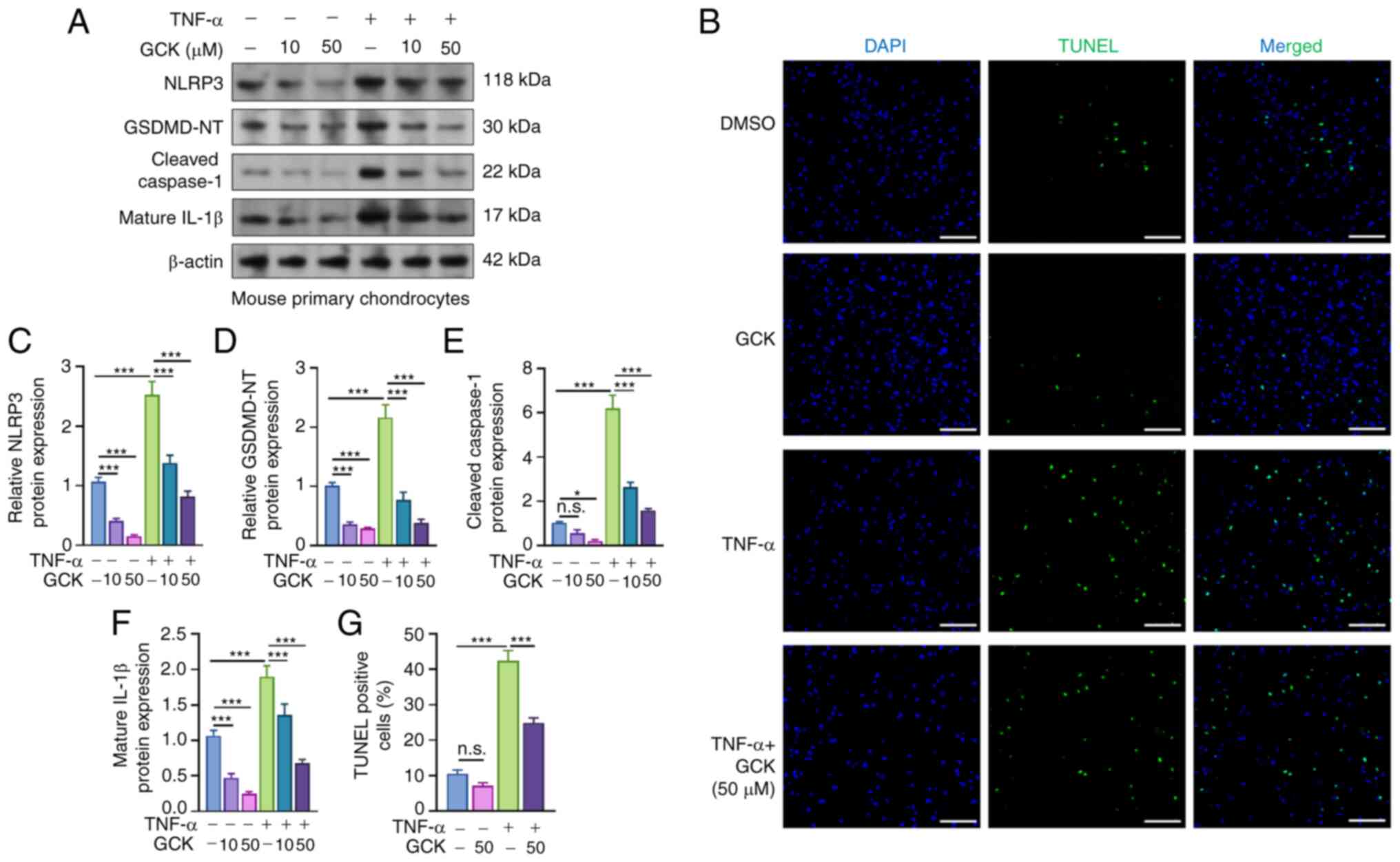 In PMCs, TNF-α treatment stimulated a significant increase in the levels of NLRP3, GSDMD-NT, cleaved caspase-1 and mature IL-1β, the markers indicating the occurrence of pyroptosis (5) (Fig. 3A and C-F). However, GCK treatment suppressed the increase of these proteins in a dose-dependent manner (Fig. 3A and C-F). TUNEL assay was then used to examine the extent of cell death of PMCs. The TNF-α treatment group had a significantly higher level of TUNEL-positive cells compared with that in the DMSO group (Fig. 3B and G). However, GCK treatment decreased the percentage of TUNEL-positive PMCs induced by TNF-α (Fig. 3B and G).