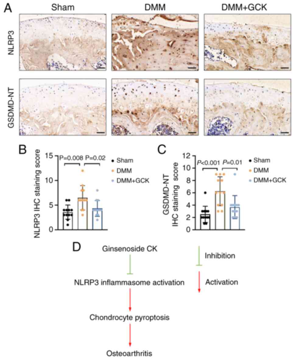 IHC analysis of the knee joint tissue sections from DMM mice with or without GCK treatment confirmed that NLRP3 and GSDMD-NT expression was significantly increased in the cartilage of the DMM mice compared with that in the sham control group (Fig. 4A-C). Compared with that in the DMM mice without GCK treatment, the DMM mice that received GCK treatment exhibited significantly reduced NLRP3 and GSDMD-NT expression (Fig. 4A-C).