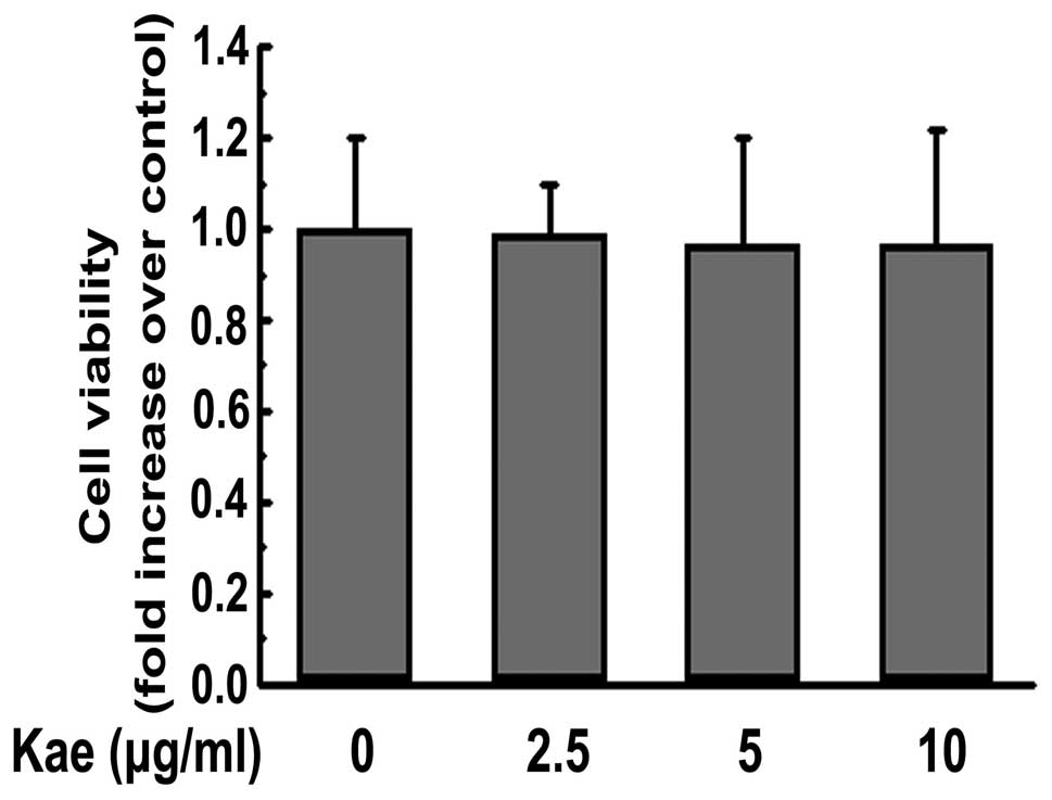 The cytotoxicity of kaempferol at various concentrations (2.5, 5 and 10 μg/ml) was not obvious after 24 h of incubation (Fig. 2). Therefore, a concentration range of 2.5–10 μg/ml was chosen for subsequent experiments.