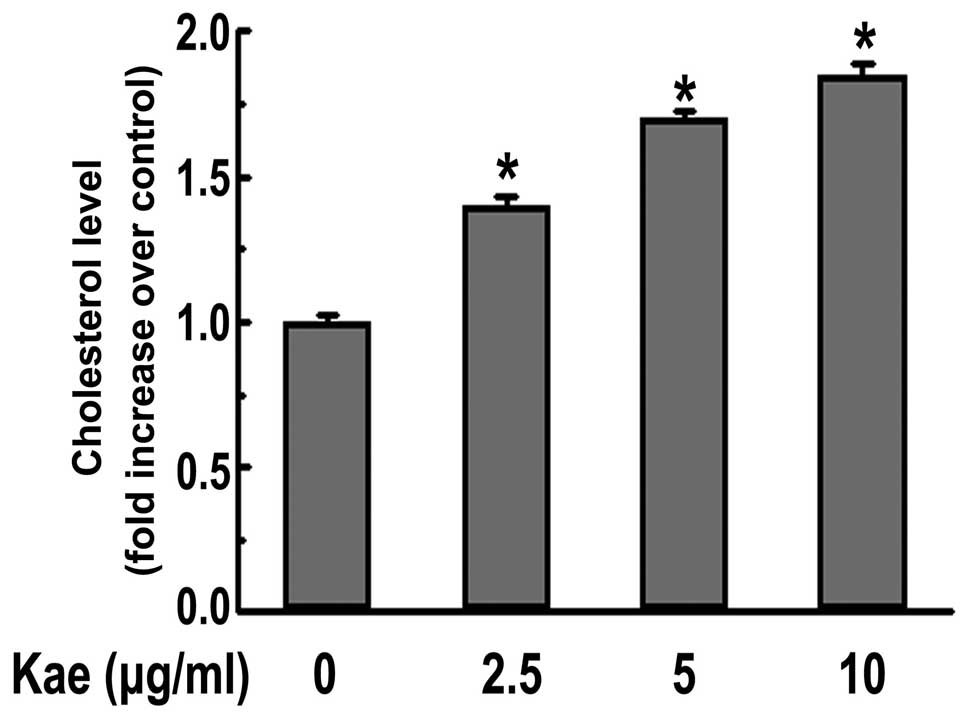 Flavonoids are normal constituents of the human diet and are known to have anti-inflammatory potential, as well as antioxidant properties both in animal and human models (8,9). Kaempferol, a flavonoid present in various natural sources including tea, cabbage, beans, tomatoes, onions, leeks and apples, has been shown to exert several beneficial effects in cardiovascular and nerve systems, such as the reduction of hydroxyl radicals (10), and inflammatory response in macrophage cells (11). Current research indicates that kaempferol ameliorates the development of atherosclerosis in apolipoprotein E-deficient mice (12); however, the mechanisms responsible for the anti-atherogenic effects of kaempferol are not yet fully defined. As mentioned above, SRs and RCTs are potential molecular targets for the selective delivery of anti-atherosclerosis agents to foam cells. Therefore, we hypothesized that the anti-atherogenic effects of kaempferol are related to the suppression of foam cell formation by regulating the expression of SRs and RCTs. Furthermore, a number of studies have reported that heme oxygenase-1 (HO-1), the critical enzyme in heme catabolism, or activator protein-1 (AP-1) mediates the antioxidative or anti-inflammatory properties of kaempferol, respectively (13,14). However, whether HO-1 or AP-1 contributes to the suppression of the formation of foam cells by kaempferol warrants further investigation.