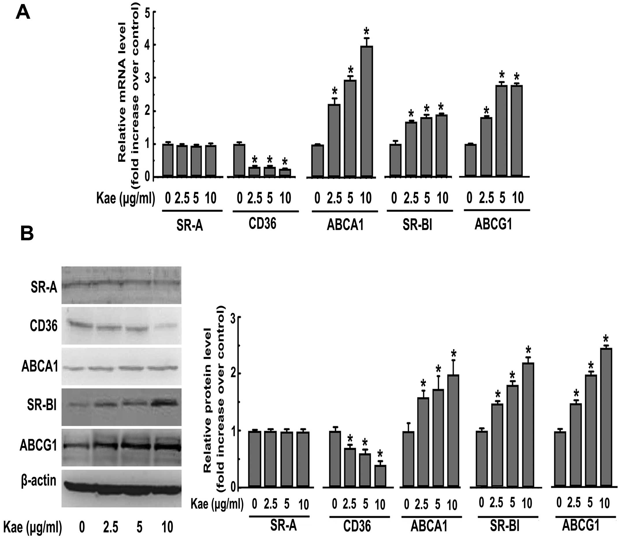 Kaempferol increases the expression of SR-BI, ABCA1 and ABCG1, but decreases the expression of CD36 in macrophages