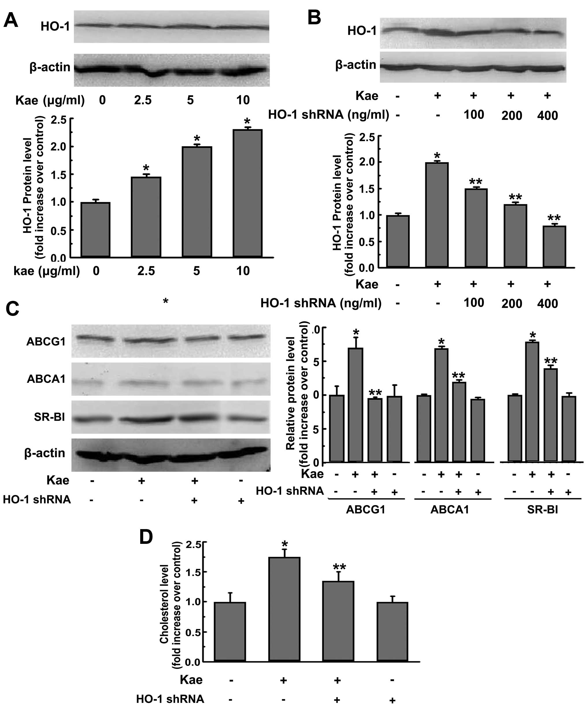 In addition to its effect on CD36 expression, we further investigated the effect of kaempferol on the expression of ABCA1, ABCG1 and SR-BI, 3 major transporters for cholesterol efflux from macrophage foam cells. Duh et al reported that kaempferol increases ABCA1 and SR-BI expression in RAW264.7 macrophages (28), and similar results were obtained in THP-1-derived macrophages in this study. Moreover, we found that ABCG1 expression was also increased in response to kaempferol treatment. It is well established that ABCA1, ABCG1 and SR-BI play a critical role in the cholesterol homeostasis in macrophages (29). Studies using individual transporter-deficient animals showed that atherosclerotic lesions and foam cell accumulation were markedly promoted (17). Recent studies have indicated that the elevated function of RCTs in macrophages, leading to reduced deposition of cholesterol in macrophages, by several dietary flavonoids with anti-atherogenic properties, such as quercetin, EGb 761 and daidzein and resveratrol (18,30,31). In view of their function, the upregulation of ABCA1, ABCG1 and SR-BI expression following kaempferol treatment observed in the current study is likely to promote the cholesterol efflux and subsequent inhibits foam cell formation. More importantly, our results suggest that the induced expression of ABCA1, SR-BI and ABCG1 by kaempferol is accompanied by increased HO-1 expression. This finding was further supported by the results from western blot analysis, in which the kaempferol-mediated upregulation of ABCA1, SR-BI and ABCG1 was reversed by the knockdown of the HO-1 gene using shRNA. In addition, the inhibition of HO-1 attenuated the kaempferol effects on the upregulation of cholesterol efflux and the downregulation of lipid accumulation in macrophages. These results suggest that the expression of HO-1 is required for the induction of ABCA1, SR-BI and ABCG1 expression by kaempferol. Our findings are in agreement with reports that the exogenous overexpression of HO-1 using agonist or adenovirus retards the progression of atherosclerosis in hyperlipidaemic mice (32,33). Although the detailed mechanisms of how kaempferol affects the functions of HO-1 remain to be further investigated, in this study, we discovered a unique pathway for the kaempferol-mediated upregulation of ABCA1, SR-BI and ABCG1. A number of studies have reported that bilirubin or carbon monoxide regulate the antioxidative or anti-inflammatory action of HO-1 (32,34). The involvement of this pathway in the kaempferol-elicited induction of ABCA1, SR-BI and ABCG1 expression remains to be investigated in the future.