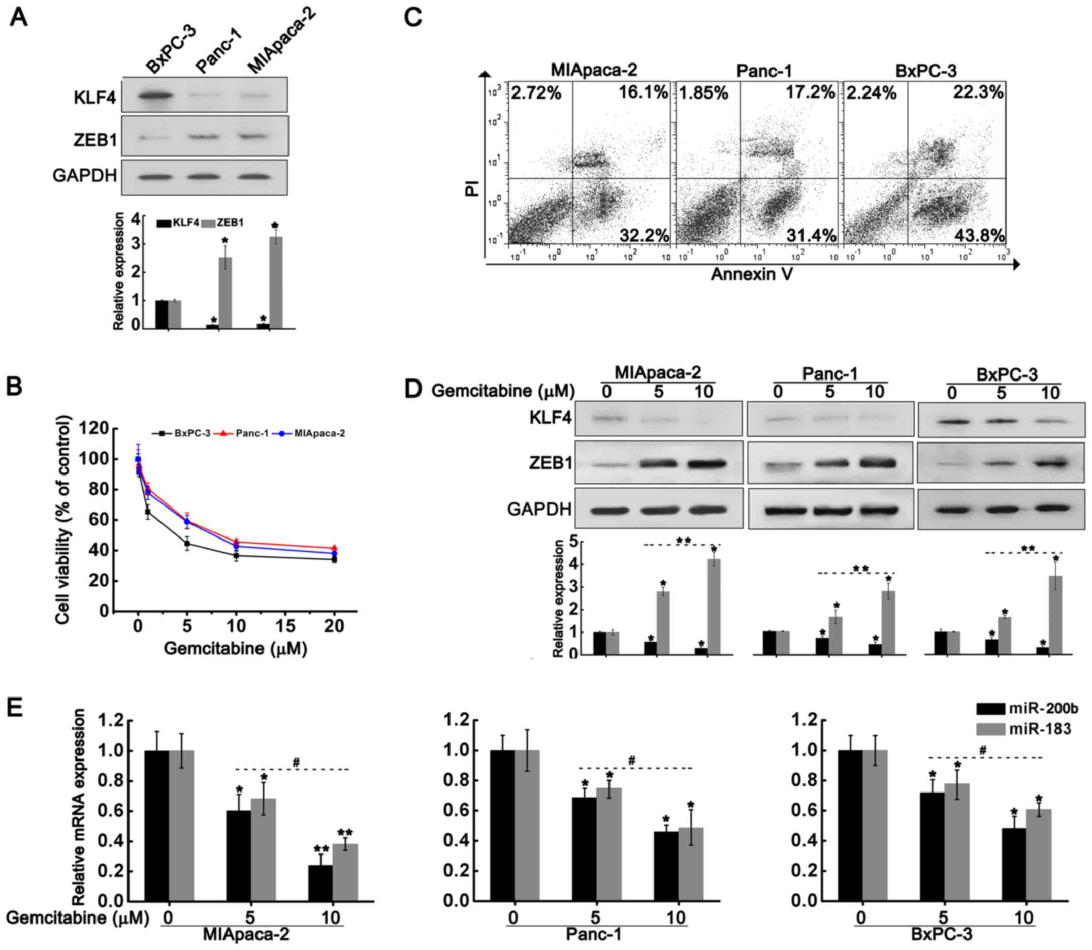 The following monoclonal antibodies (mAbs) and polyclonal antibodies (pAbs) were used: anti-KLF4 (pAb, ab106629), and anti-ZEB1 (pAb, ab155249) were purchased from Abcam (Cambridge, MA, USA); anti-GAPDH (pAb) was purchased from Anbo Biotechnology Co. (San Francisco, CA, USA); Cell counting kit-8 was purchased from Dojindo Laboratories (Tokyo, Japan). Gemcitabine was purchased from Eli Lilly (Indianapolis, IN, USA). ZEB1 siRNA, miR-200b and miR-183 were synthesized by Biosune Biotechnology (Shanghai, China).