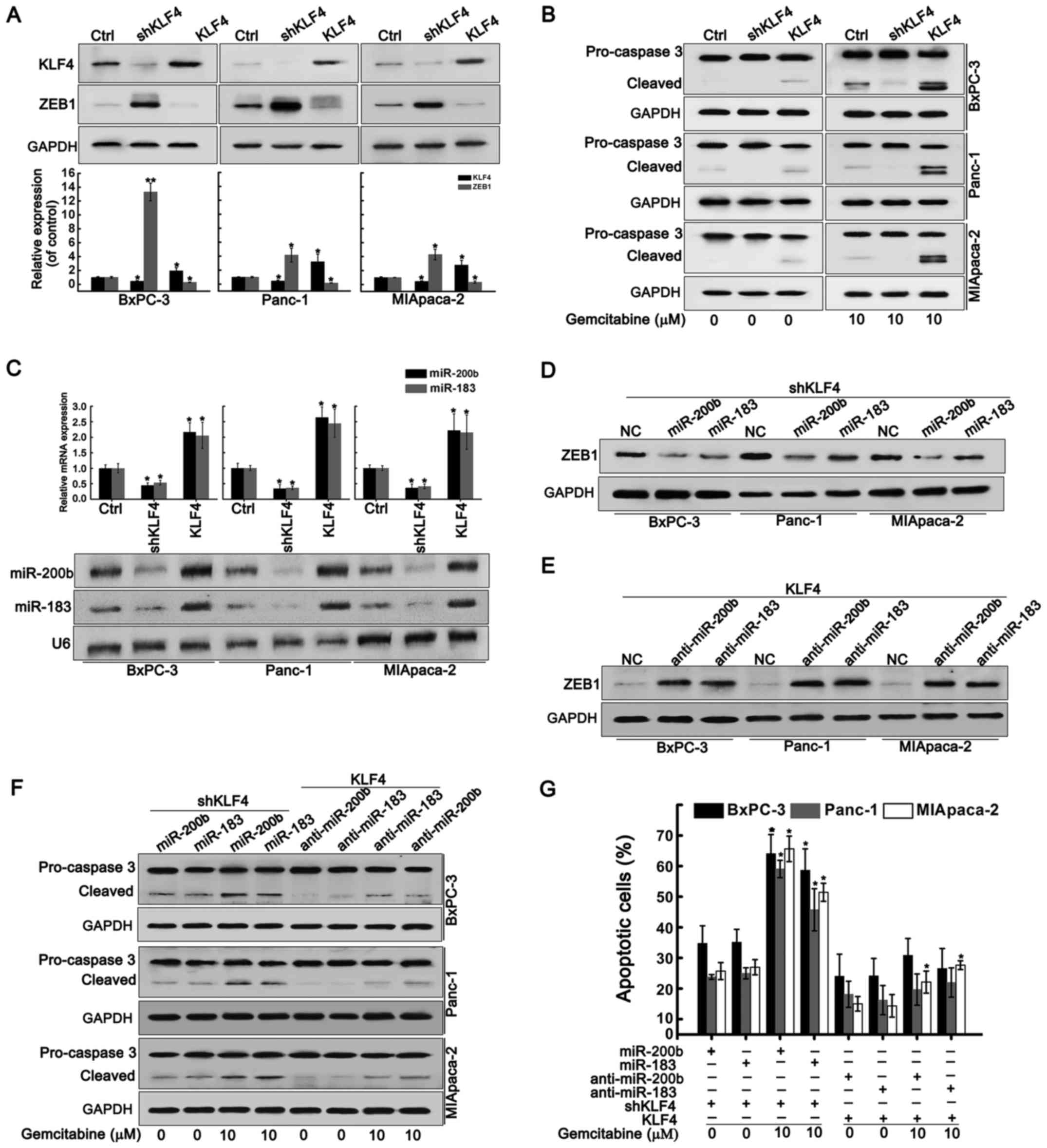 Next, we examined the correlation between KLF4 and ZEB1. KLF4 knockdown significantly promoted ZEB1 expression while KLF4 overexpression inhibited ZEB1 expression (Fig. 2A). KLF4 depletion inhibited gemcitabine-induced activation of caspase 3 while KLF4 overexpression promoted the activation of caspase 3 even in the absence of gemcitabine (Fig. 2B), suggesting that KLF4 downregulation conferred gemcitabine resistance of PDAC cells. KLF4 knockdown restrained the expression of miR-200b and miR-183 (Fig. 2C). In contrast, KLF4 overexpression elevated the levels of miR-200b and miR-183 (Fig. 2C). In KLF4-depleted cells, forced expression of miR-200b and miR-183 repressed the ZEB1 expression again (Fig. 2D). In KLF4-overexpressing cells, forced expression of anti-miR-200b and anti-miR-183 restored the ZEB1 expression (Fig. 2E). Restoration of miR-200b and miR-183 activated caspase 3 in KLF4-depleted cells whereas anti-miR-200b and anti-miR-183 significantly reduced caspase 3 activation in KLF-overexpressing cells (Fig. 2F). Overexpression of miR-200b and miR-183 in KLF-4-depleted cells promoted cell apoptosis in the presence of gemcitabine, but inhibition of miR-200b and miR-183 in KLF-4-overexpressing cells blocked cell apoptosis induced by gemcitabine (Fig. 2G). These results suggested that KLF4 knockdown contributed to ZEB1 expression and gemcitabine resistance by suppressing miR-200b and miR-183.