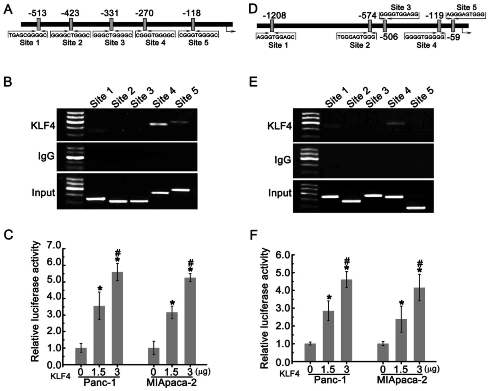 Since KLF4 is a transcriptional factor that regulates the expression of multiple genes, we hypothesized that KLF4 directly regulated the expression of miR-200b and miR-183. The putative binding sites of KLF4 located on the promoters of miR-200b and miR-183 were shown in Fig. 3A and D. Chromatin immunoprecipitation (ChIP) assays revealed that KLF4 could interact with site 4 and 5 in the miR-200b promoter and the site 4 in the miR-183 promoter (Fig. 3B and E). We subsequently constructed the pGL3-200-luc and pGL3-183-luc plasmids by inserting these sequences into the pGL3 luciferase reporter. Panc-1 and MIApaca-2 cells were co-transfected with 0.2 µg pGL3-200-luc or pGL3-183-luc and the indicated concentration of pcDNA3.1 carrying KLF4 together with 100 ng pRL-SV40. As shown in Fig. 3C and F, with the increasing dose, KLF4 substantially enhanced luciferase activities. These data suggested that KLF4 positively regulated the expression of miR-200b and miR-183 by directly binding to their promoters.