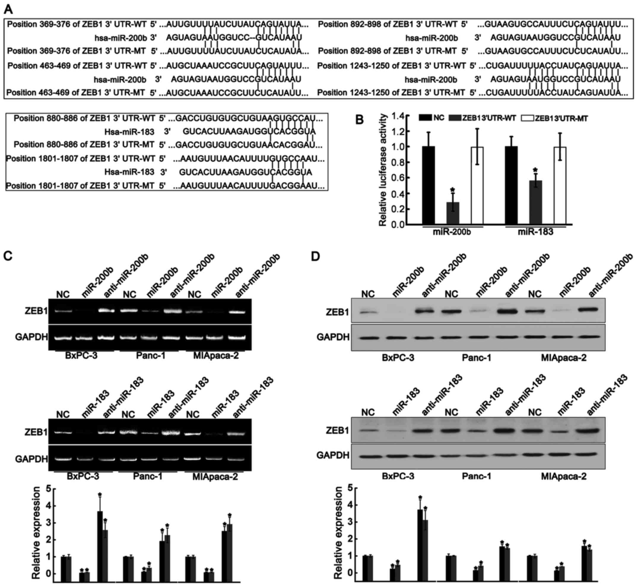We further explored whether miR-200b and miR-183 directly targeted the-3′UTR region of ZEB1. Targetscan (http://www.targetscan.org/) was used to predict the recognition sites of miR-200b and miR-183. As shown in Fig. 4A, four putative sites for miR-200b and two putative sites for miR-183 were found. The sequences containing these sites were cloned into the luciferase reporter plasmid to obtain the ZEB1-3′UTR-WT-luc plasmid (wild-type), and the sequence containing the mutant sites was cloned to construct ZEB1-3′UTR-MT-luc plasmid (mutant type). Subsequently, the Panc-1 cells were co-transfected with ZEB1-3′UTR-WT or ZEB1-3′UTR-MT and miR-200b or miR-183. Both miR-200b and miR-183 significantly inhibited luciferase activities in the cells carrying ZEB1-3′UTR-WT compared to those carrying negative control (NC) and ZEB1-3′UTR-MT (Fig. 4B). Furthermore, both miR-200b and miR-183 notably reduced mRNA and protein levels of ZEB1 in BxPC-3, Panc-1 and MIApaca-2 cells (Fig. 4C and D). Conversely, both anti-miR-200b and anti-miR-183 elevated mRNA and protein levels of ZEB1 (Fig. 4C and D). These results indicated that miR-200b and miR-183 directly targeted ZEB1.