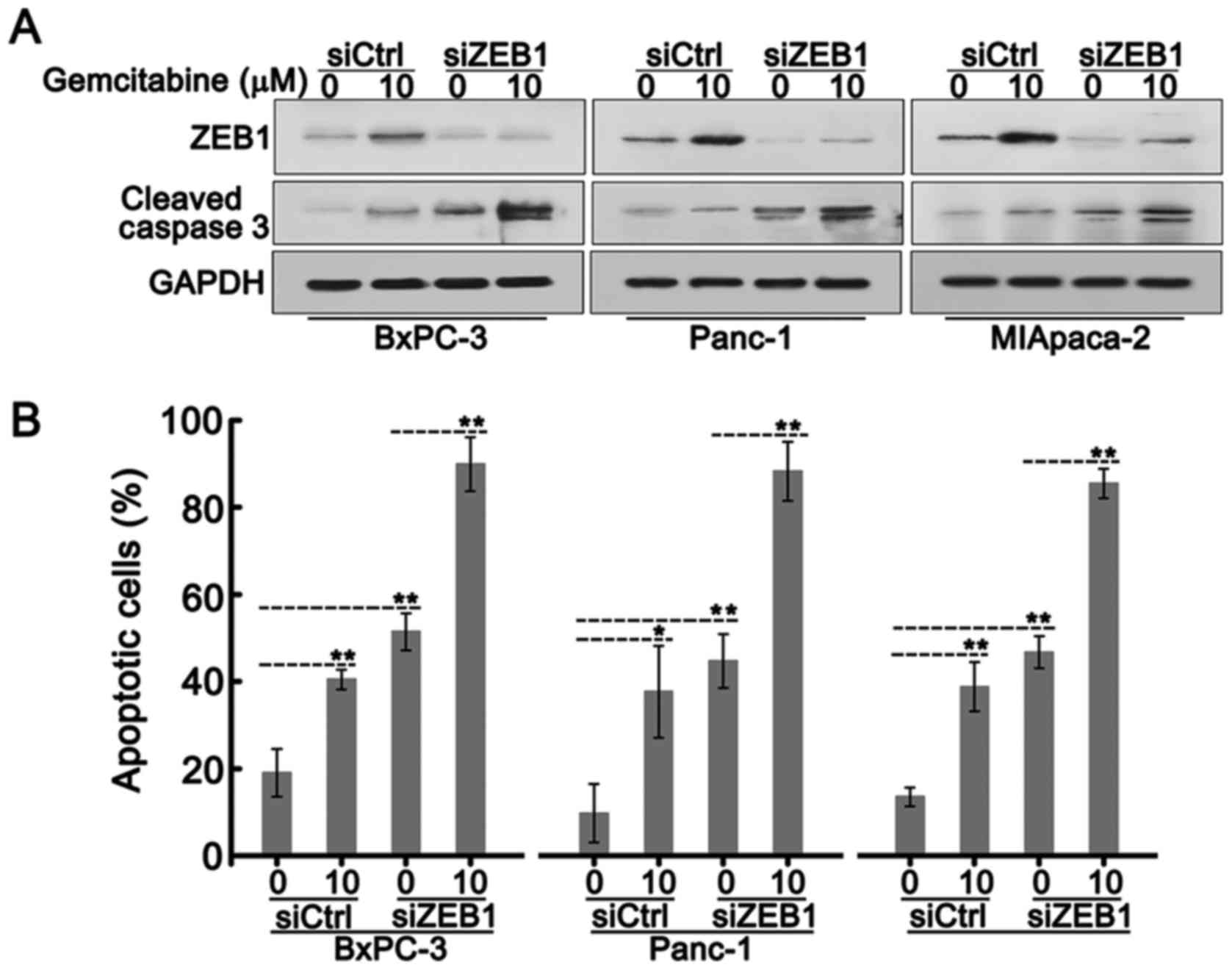 As shown in Fig. 5A, gemcitabine treatment promoted ZEB1 expression, which was consistent with the results in Fig. 1D. ZEB1 knockdown mildly activated caspase 3. A combination of ZEB1 knockdown and gemcitabine significantly increased cleaved caspase 3, suggesting that ZEB1 knockdown facilitated gemcitabine sensitivity of PDAC cells. Fig. 5B illustrated that gemcitabine treatment induced cell apoptosis in ZEB1-depleted cells. These data indicated that ZEB1 knockdown contributed to gemcitabine sensitivity of PDAC cells.