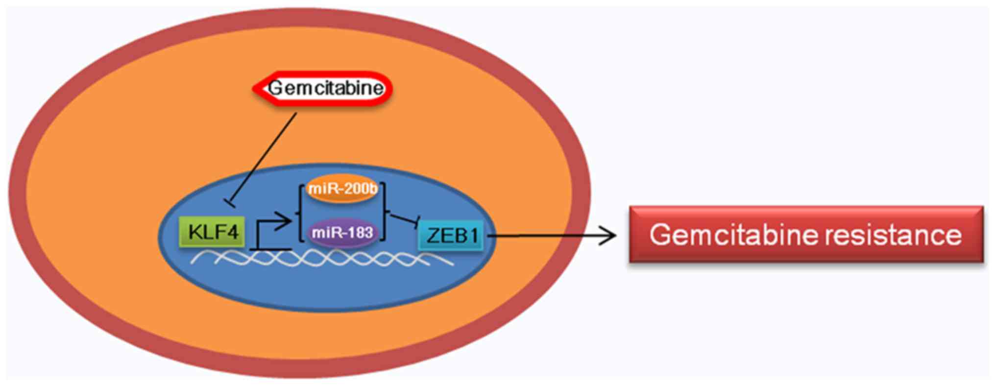 In this study, we showed that gemcitabine treatment inhibited KLF4 expression and promoted ZEB1 expression. Further investigation demonstrated that KLF4 suppressed ZEB1 expression and gemcitabine resistance by directly regulating the expression of miR-200b and miR-183. In addition, ZEB1 knockdown attenuated gemcitabine resistance in PDAC cells.