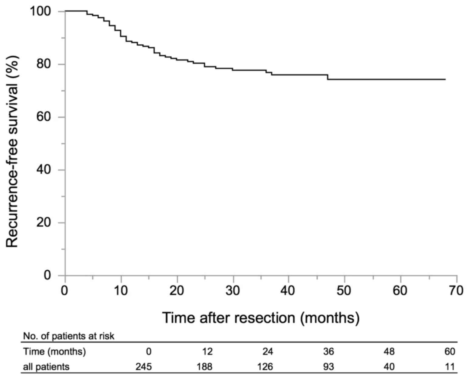 Statistical analyses were performed with JMP Pro version 12 (SAS Institute, Tokyo, Japan). Actuarial RFS and PFS were calculated by Kaplan-Meier analysis, and univariate comparisons between groups were assessed by log-rank tests. Univariate and multivariate analysis were performed using a Cox proportional hazards model to identify the variables that predict prognostic outcomes. Values of P<0.05 were considered to be statistically significant.