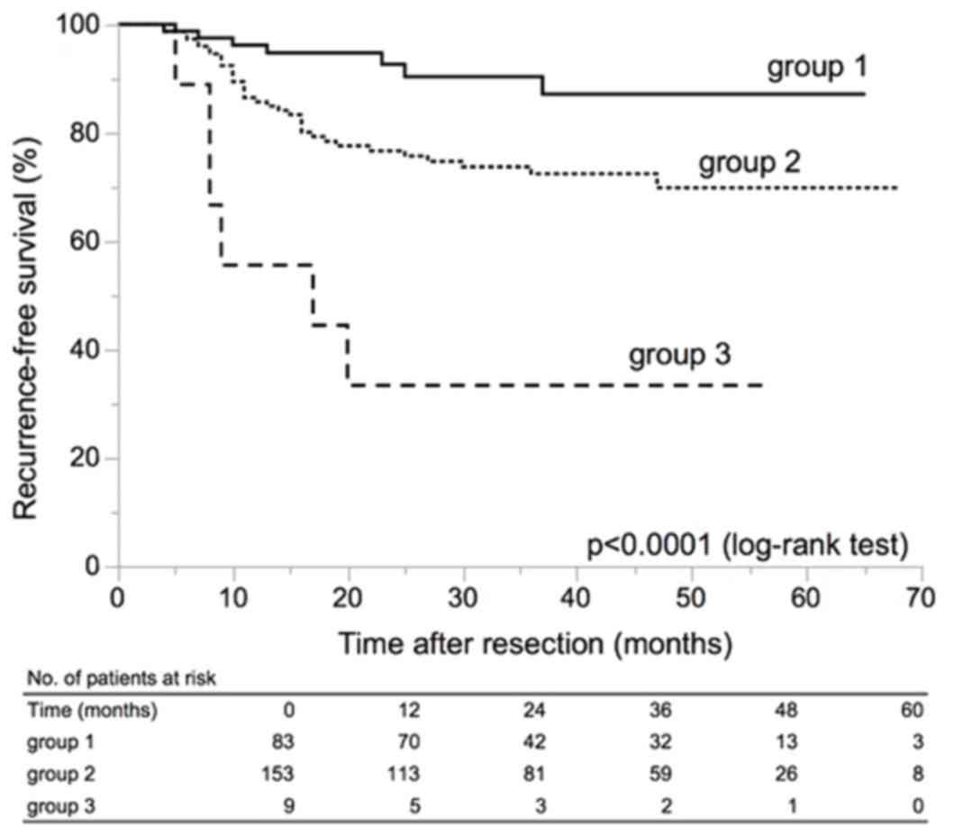 Among the above clinicopathological variables, we selected two variables for risk stratification in patients with primary LG Ta UC: tumor number ≥8 and tumor size ≥1.5 cm based on the results of multivariate analyses. The patients were classified into three groups as follows: Group 1, patients with a single tumor and maximum tumor diameter less than 1.5 cm; group 3, patients with 8 or more tumors and maximum tumor diameter 1.5 cm or larger; group 2, patients who did not belong to group 1 or group 3. These three groups showed significantly different RFS (Fig. 2) (P<0.0001).