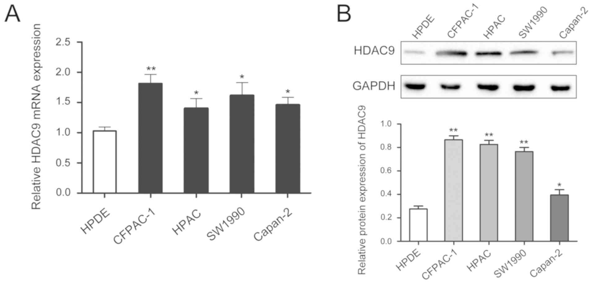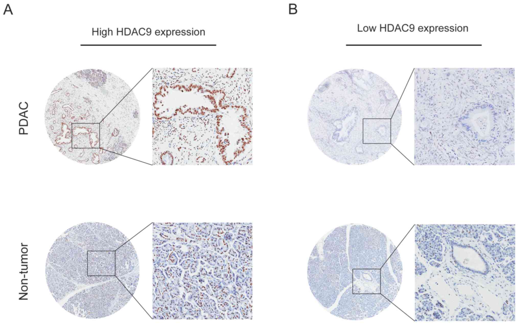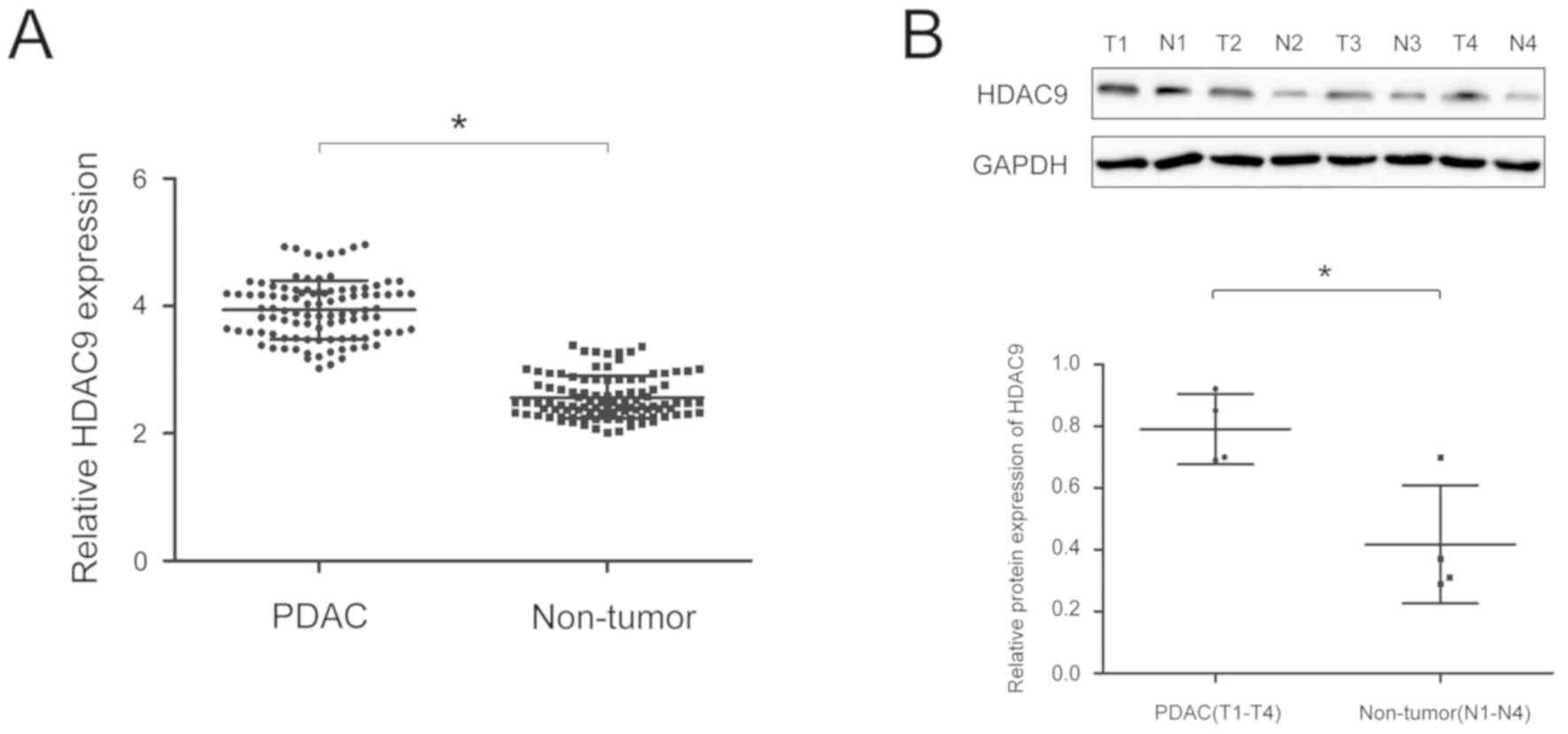 To the best of our knowledge, the role of HDAC9 in the development and progression of the PDAC has not been previously studied. The present study investigated the expression levels of HDAC9 in PDAC using reverse transcription-quantitative PCR (RT-qPCR), western blotting and immunohistochemistry (IHC). In addition, the present study evaluated associations between HDAC9 expression levels, and the clinicopathologic parameters and prognosis of patients with PDAC.
