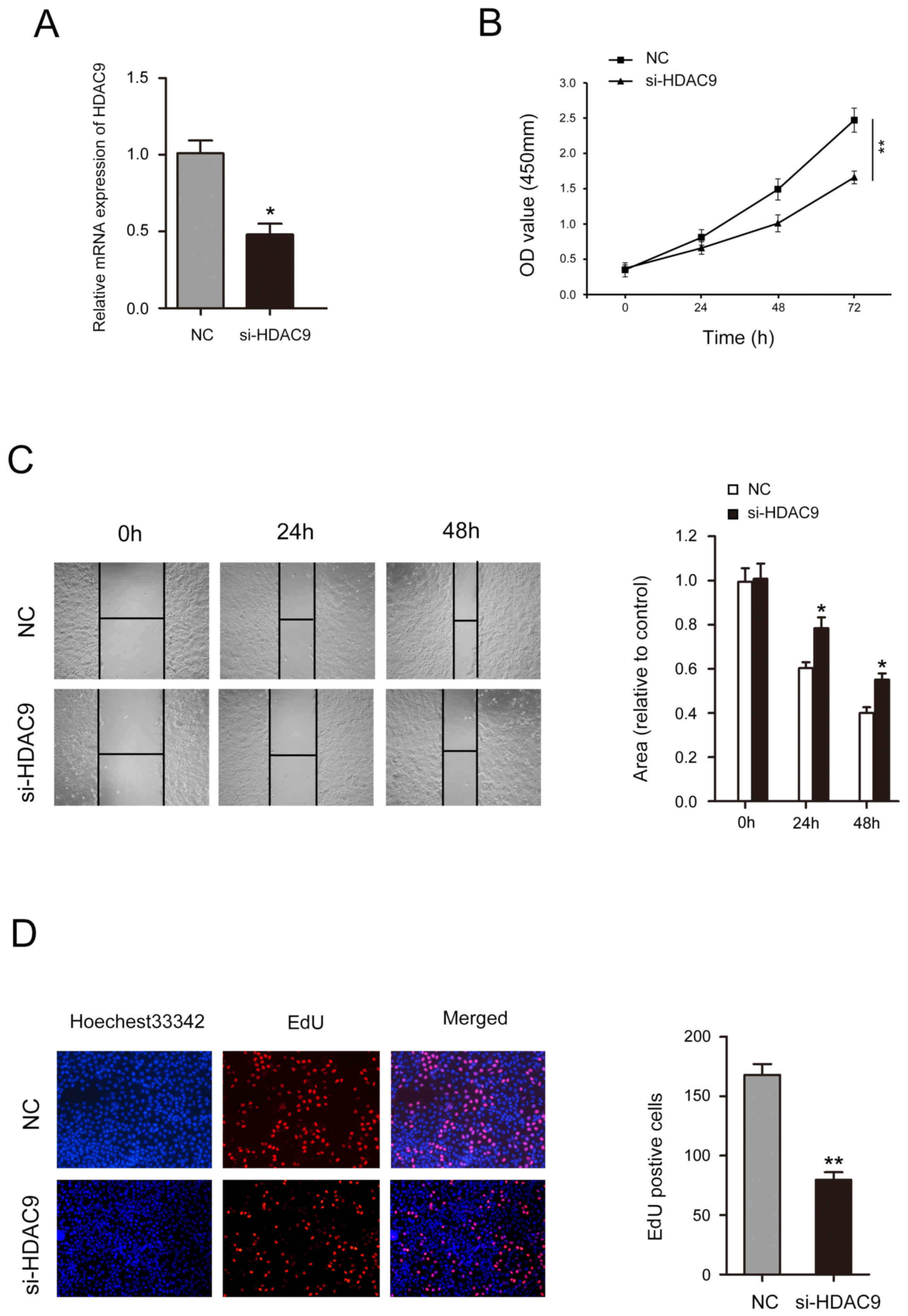 After treatment with si-HDAC9, the expression level of HDAC9 was significantly decreased (Fig. 5A). A CCK-8 assay identified that decreased HDAC9 expression significantly inhibited cell proliferation in CFPAC-1 cells (Fig. 5B). Wound healing assay results indicated that CFPAC-1 cell mobility was significantly decreased following HDAC9 knockdown (Fig. 5C). The number of CFPAC-1 cells incorporating EdU in the HDAC9 knockdown group was significantly decreased compared with the control group (Fig. 5D).