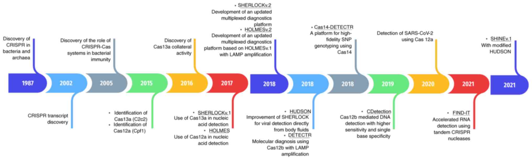 Mustafa MI and Makhawi AM: SHERLOCK and DETECTR: CRISPR-Cas systems as potential rapid diagnostic tools for emerging infectious diseases. J Clin Microbiol. 59:e00745–20. 2021. View Article : Google Scholar : PubMed/NCBI | |