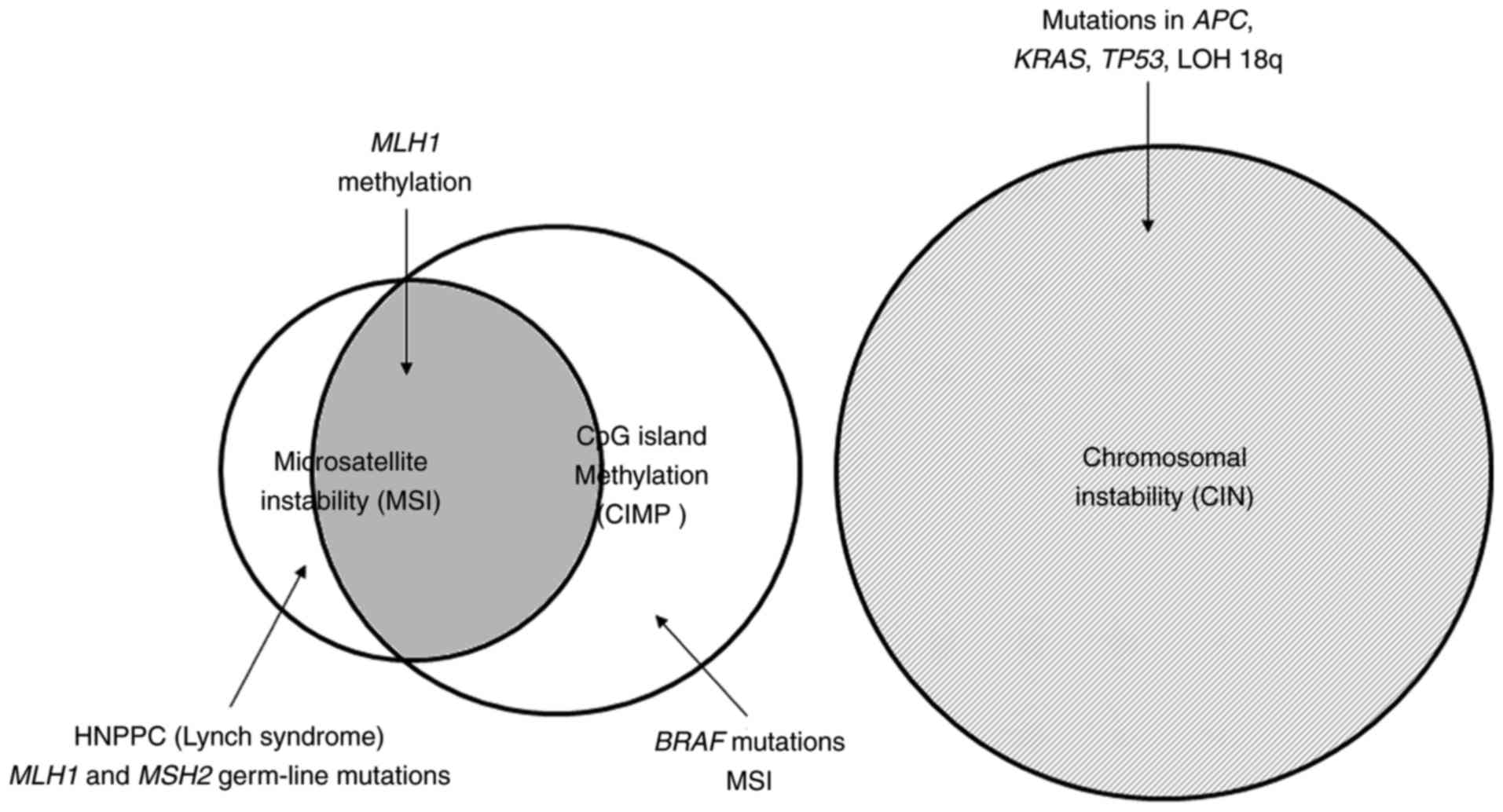 CRC, like numerous other solid tumors, is a heterogeneous disease in which different subtypes may be distinguished by their specific clinical and/or molecular features. The majority of sporadic CRCs (~85%) exhibit chromosomal instability (CIN), with changes in chromosome number and structure (58). These changes include gains or losses of chromosomal segments, chromosomal rearrangements, and loss of heterozygosity (LOH), which results in gene copy number variations (CNVs) (58). These alterations affect the expression of tumor-associated genes, and/or genes that regulate cell proliferation or cell cycle checkpoints, which, in turn, may activate pathways essential for CRC initiation and progression (9,10). The remaining sporadic cases (~15%) have high-frequency microsatellite instability (MSI) phenotypes. However, hereditary CRC has two well-described forms: Familial adenomatous polyposis (FAP) (<1%) patients inherit a mutated copy of the adenomatous polyposis (APC) gene, whereas hereditary non-polyposis colorectal cancer (HNPPC, or Lynch syndrome) (1–3%) is characterized by MSI, a consequence of a defective DNA mismatch repair (MMR) system (11). The other forms of hereditary CRC include a rare syndrome called hamartomatous polyposis syndrome (<1%) and the common inherited cases caused by less penetrant inherited mutations (32%) (3).