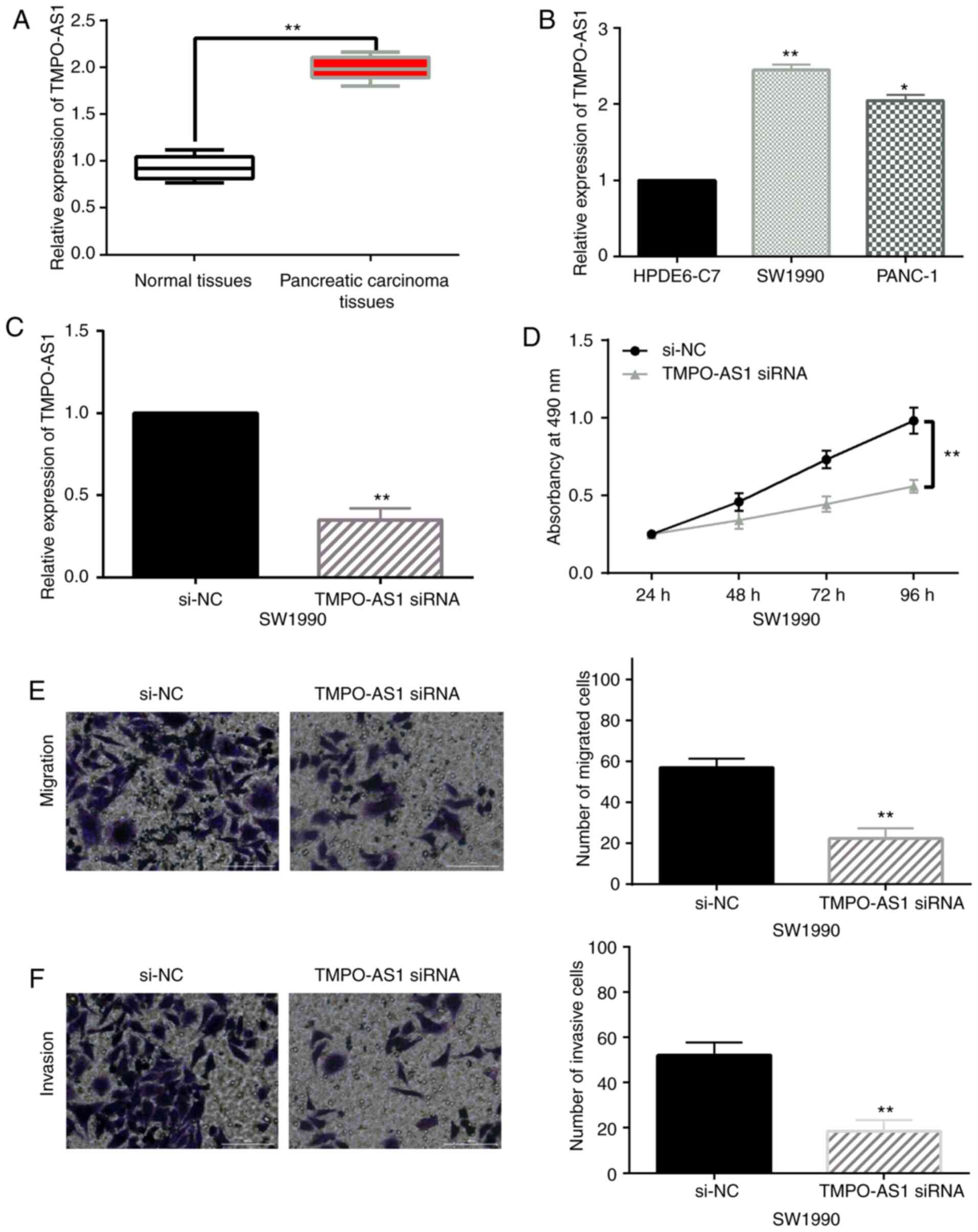 Compared with normal tissues, TMPO-AS1 expression was upregulated in pancreatic carcinoma tissues (Fig. 1A). Similarly, the expression of lncRNA TMPO-AS1 in SW1990 and PANC-1 pancreatic cancer cells was higher than that in HPDE6-C7 cells (Fig. 1B). Based on the aforementioned results, SW1990 cells were used to investigate the function of TMPO-AS1 in pancreatic carcinoma due to the significant difference of TMPO-AS1 expression. Next, TMPO-AS1 siRNA was transfected into SW1990 cells. The transfection efficiency was detected by RT-qPCR (Fig. 1C). An MTT assay revealed that downregulation of TMPO-AS1 inhibited cell proliferation in SW1990 cells (Fig. 1D). A Transwell assay revealed that knockdown of TMPO-AS1 restrained cell migration and invasion in SW1990 cells (Fig. 1E and F). The aforementioned results indicated that the upregulation of lncRNA TMPO-AS1 promoted cell proliferation and motility in pancreatic carcinoma.