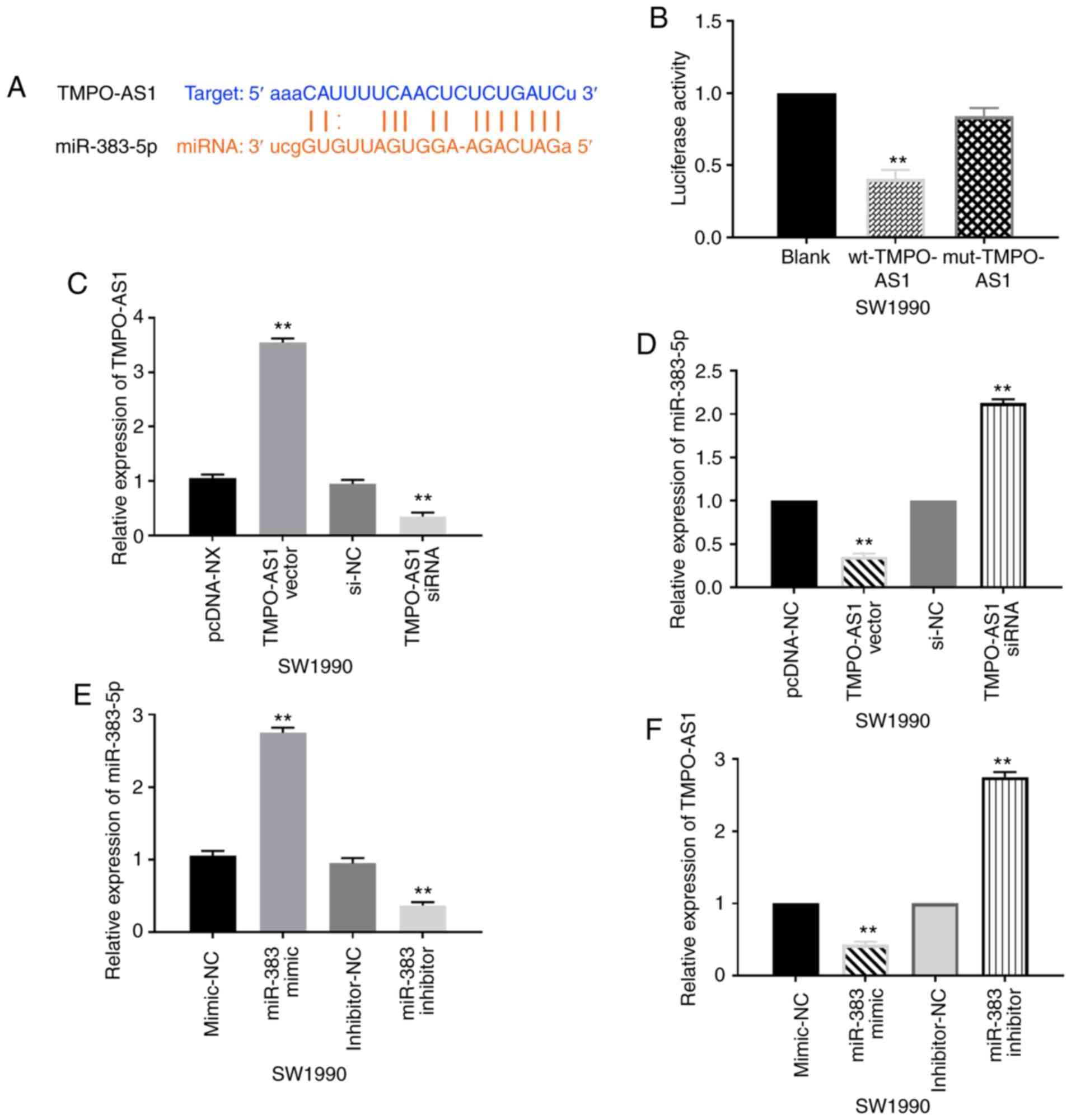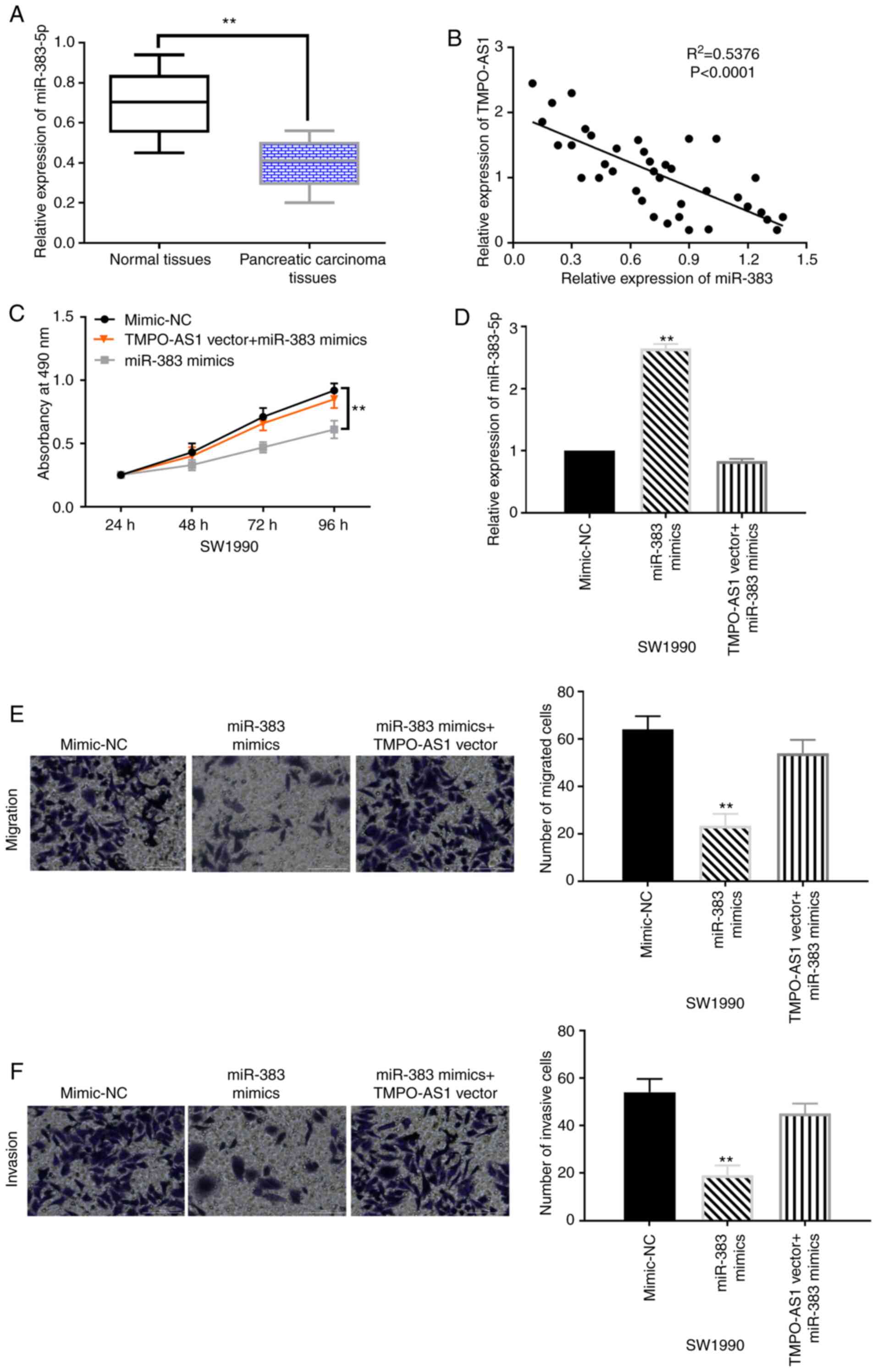 In addition, downregulation of miR-383-5p was revealed in pancreatic carcinoma tissues compared with normal tissues (Fig. 3A). A negative correlation between miR-383-5p and TMPO-AS1 expression was revealed in pancreatic carcinoma tissues (Fig. 3B). Then, the miR-383-5p mimics and lncRNA TMPO-AS1 vector were transfected into SW1990 cells to explore the role of miR-383-5p and its interaction with lncRNA TMPO-AS1. Functionally, upregulation of TMPO-AS1 attenuated the inhibitory effect of miR-383-5p on cell proliferation in SW1990 cells (Fig. 3C). The results also revealed that the increased expression of miR-383-5p induced by its mimics was reduced by the lncRNA TMPO-AS1 vector (Fig. 3D). The TMPO-AS1 vector also reversed the inhibition of cell migration and invasion induced by miR-383-5p overexpression in SW1990 cells (Fig. 3E and F). These results indicated that overexpression of miR-383-5p inhibited cell proliferation and motility in pancreatic carcinoma. Moreover, the upregulation of TMPO-AS1 abolished the antitumor effects of miR-383-5p in pancreatic carcinoma.