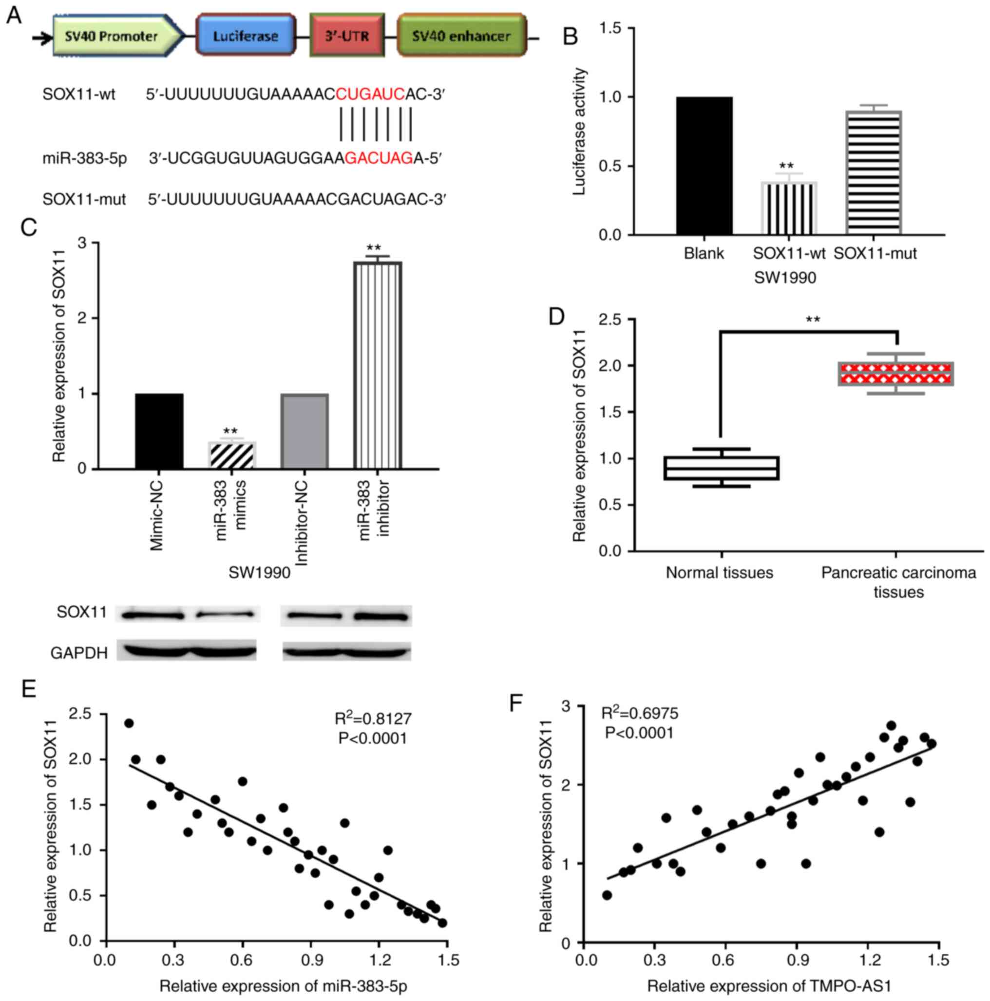 Therefore, the present study clarified the regulatory mechanism of the lncRNA TMPO-AS1/miR-383-5p/SOX11 axis. Concurrently, the functions of lncRNA TMPO-AS1, miR-383-5p and SOX11 were also investigated in pancreatic cancer. This research will help us better understand the functional mechanism of lncRNA TMPO-AS1 in pancreatic carcinoma.
