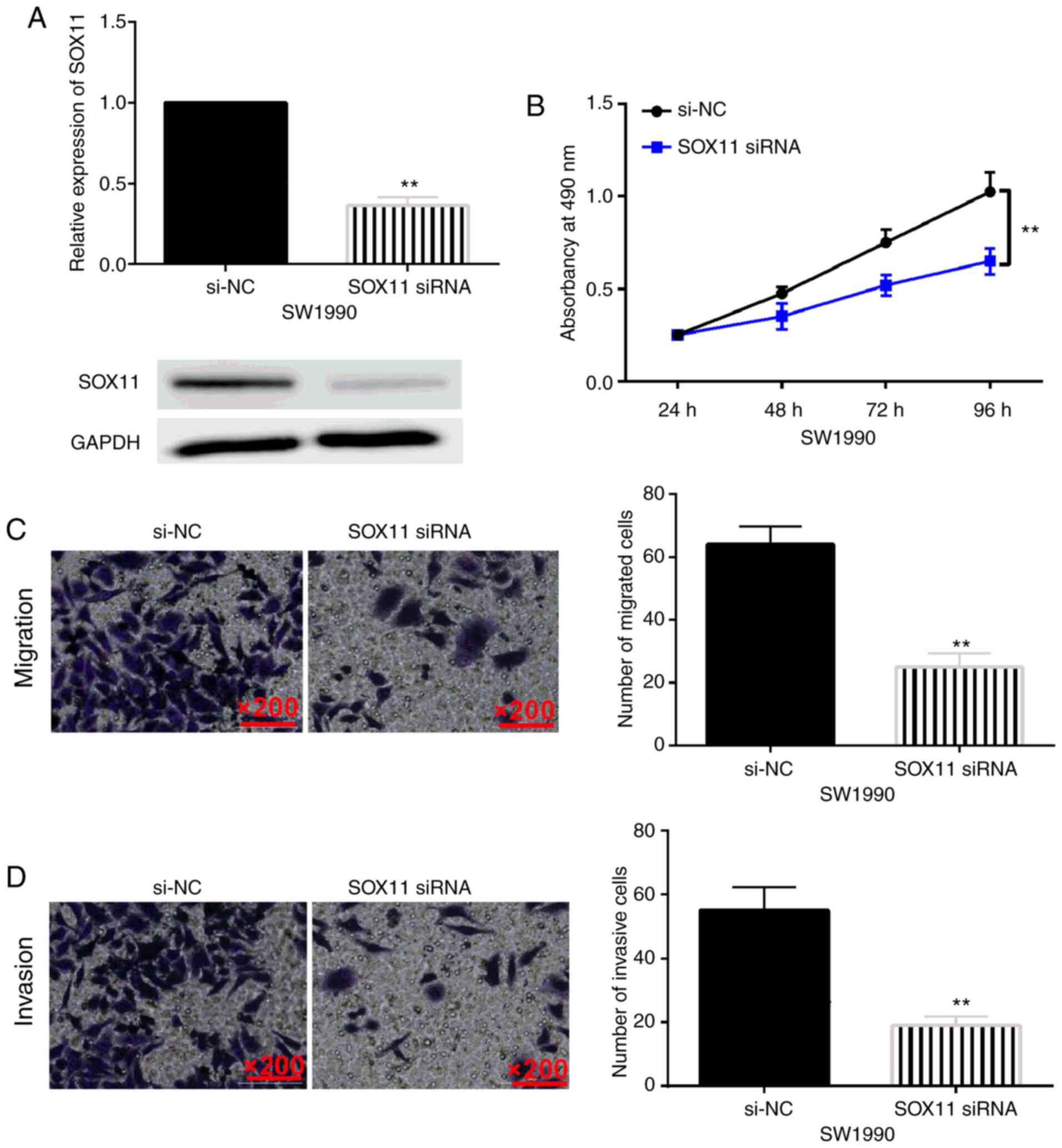 To explore the role of SOX11 in pancreatic carcinoma, SOX11 siRNA was transfected into SW1990 cells. RT-qPCR and western blotting revealed that SOX11 siRNA reduced its expression in SW1990 cells (Fig. 5A). In particular, it was determined that SOX11 downregulation inhibited cell proliferation (Fig. 5B). In addition, knockdown of SOX11 also suppressed cell migration and invasion in SW1990 cells (Fig. 5C and D). Collectively, SOX11 was revealed to play a carcinogenic role in pancreatic carcinoma by promoting cell proliferation, migration and invasion.