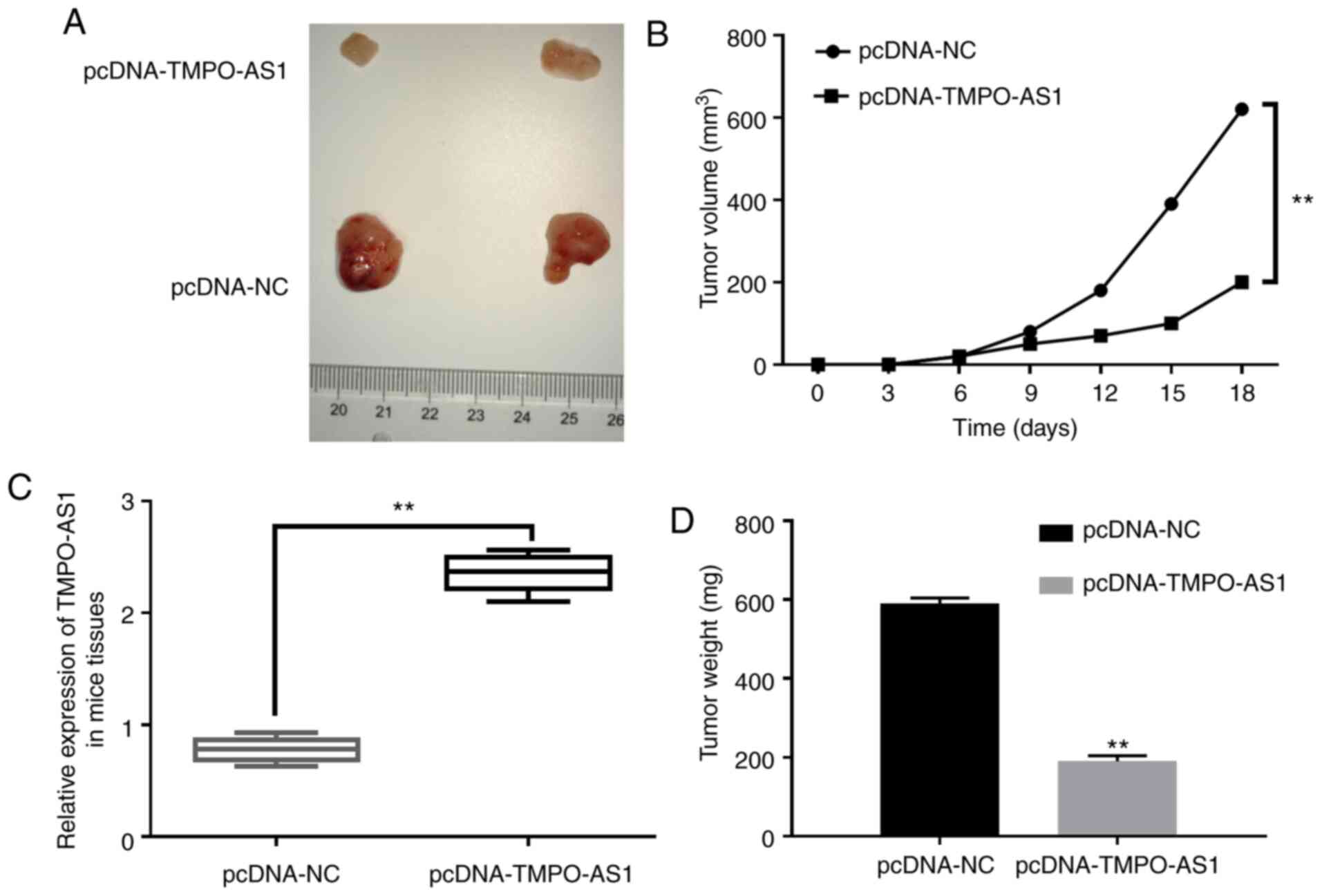 In order to verify whether TMPO-AS1 expression regulates pancreatic carcinoma tumorigenesis in vivo, xenograft analysis was performed. Consistent with previous in vitro experiments, tumor growth in the pcDNA-TMPO-AS1 group was significantly slower than the pcDNA-NC group (Fig. 6A and B). In addition, it was also revealed that lncRNA TMPO-AS1 expression in the mice tissues of the pcDNA-TMPO-AS1 group was higher than that in the pcDNA-NC group (Fig. 6C). After nude mice were sacrificed and tumors were removed, and the tumor weight in the pcDNA-TMPO-AS1 group was revealed to be lower than that in the pcDNA-NC group (Fig. 6D). These data demonstrated that lncRNA TMPO-AS1 downregulation significantly inhibited the growth of pancreatic carcinoma tumor xenograft.