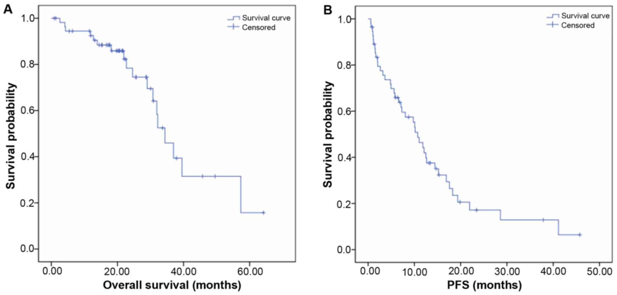The median follow-up time was 20.6 months, and 18 patients died. At the end of the study, the median OS time following liver metastasectomy was 34.4 months [95% confidence interval (CI), 28.5–40.2 months; Fig. 1A] and the median PFS time was 11.0 months (95% CI, 8.4–13.7 months; Fig. 1B).