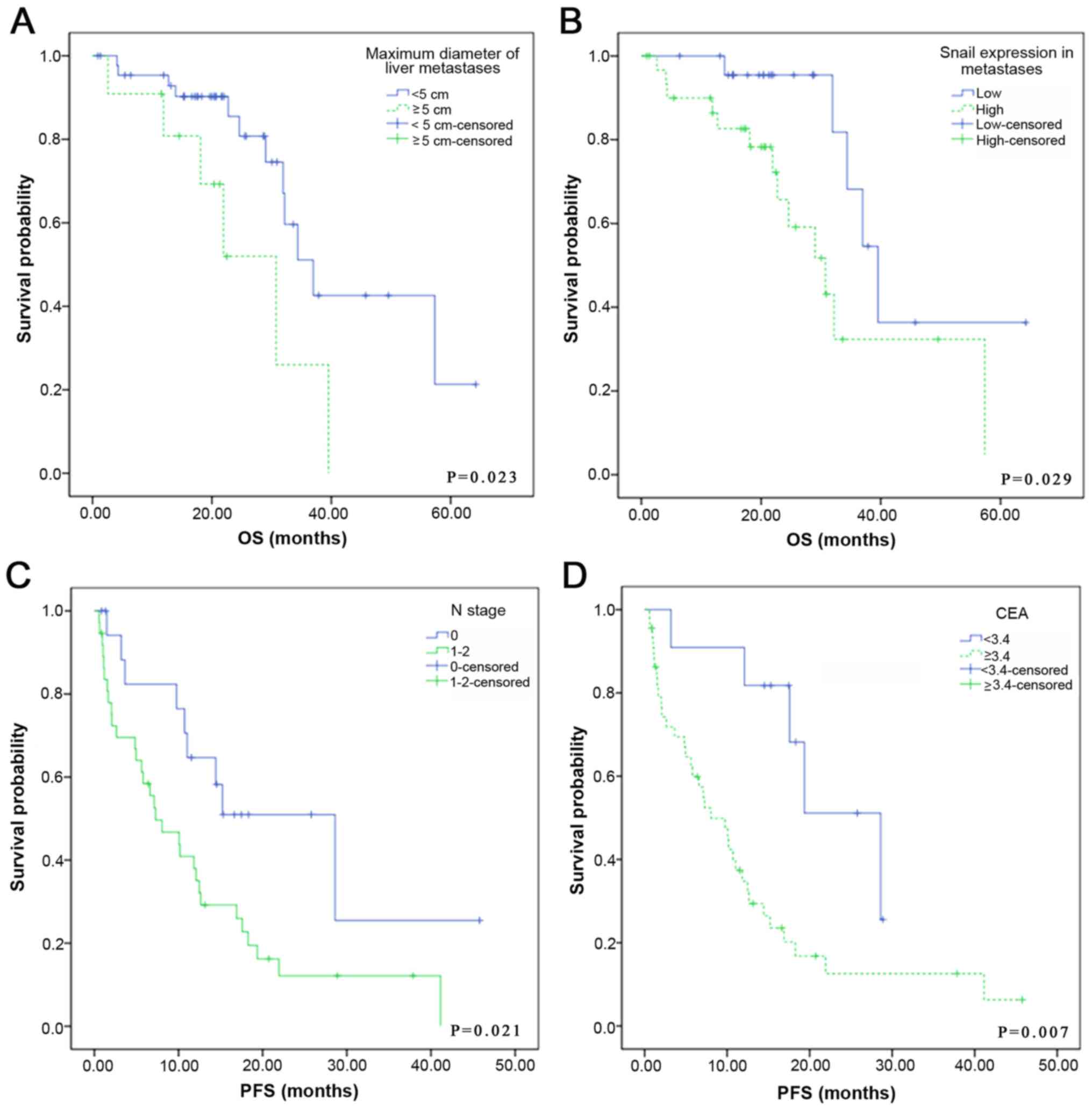Kaplan-Meier survival analysis demonstrated that the maximum diameter of liver metastases was <5 cm (P=0.023; Fig. 3A) and low Snail expression in metastases was significantly associated with a longer OS time following resection of colorectal liver metastases (P=0.029; Fig. 3B). In addition, N0 stage (P=0.021; Fig. 3C) and low CEA expression (P=0.007; Fig. 3D) were also associated with longer PFS times. Multivariate Cox regression analysis demonstrated that the maximum diameter of liver metastases [hazard ratio (HR), 3.447; 95% CI, 1.154–10.041; P=0.019) and Snail expression in liver metastases (HR, 3.405; 95% CI, 1.225–9.697; P=0.026) can be used as independent prognostic factors for OS following resection of colorectal liver metastases (Table III).