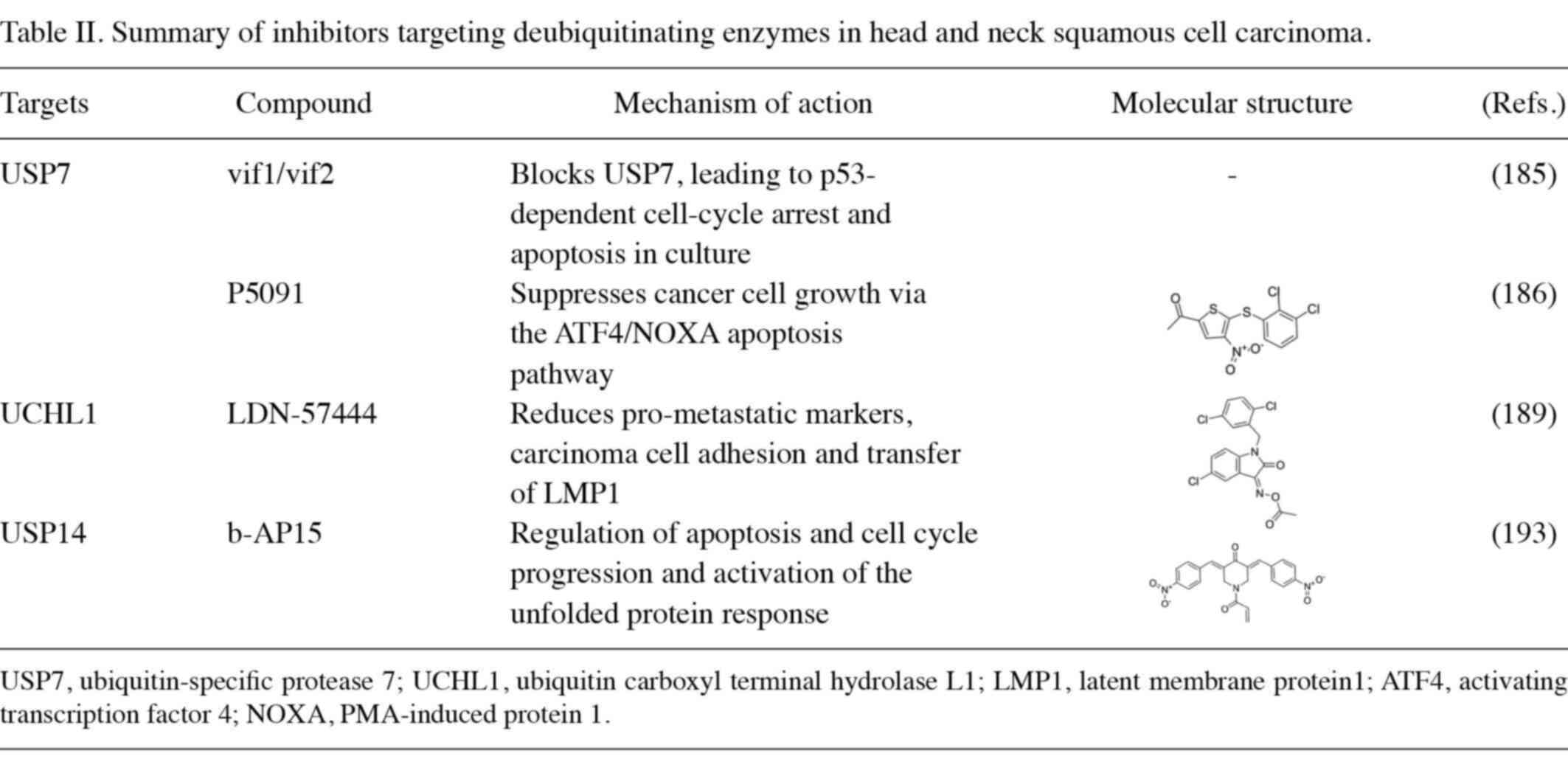 Jin S, Kudo Y and Horiguchi T: The role of deubiquitinating enzyme in head and neck squamous cell carcinoma. Int J Mol Sci. 24:5522022. View Article : Google Scholar : PubMed/NCBI | |