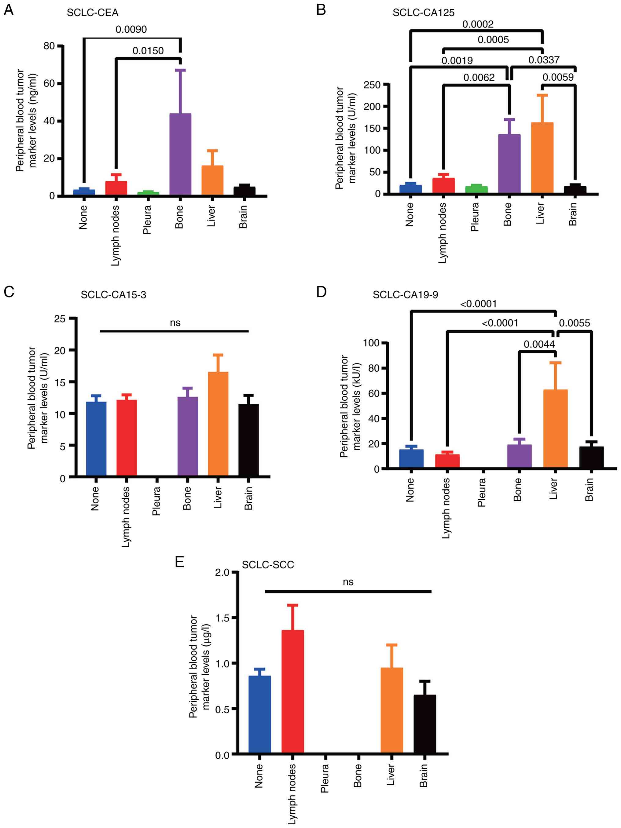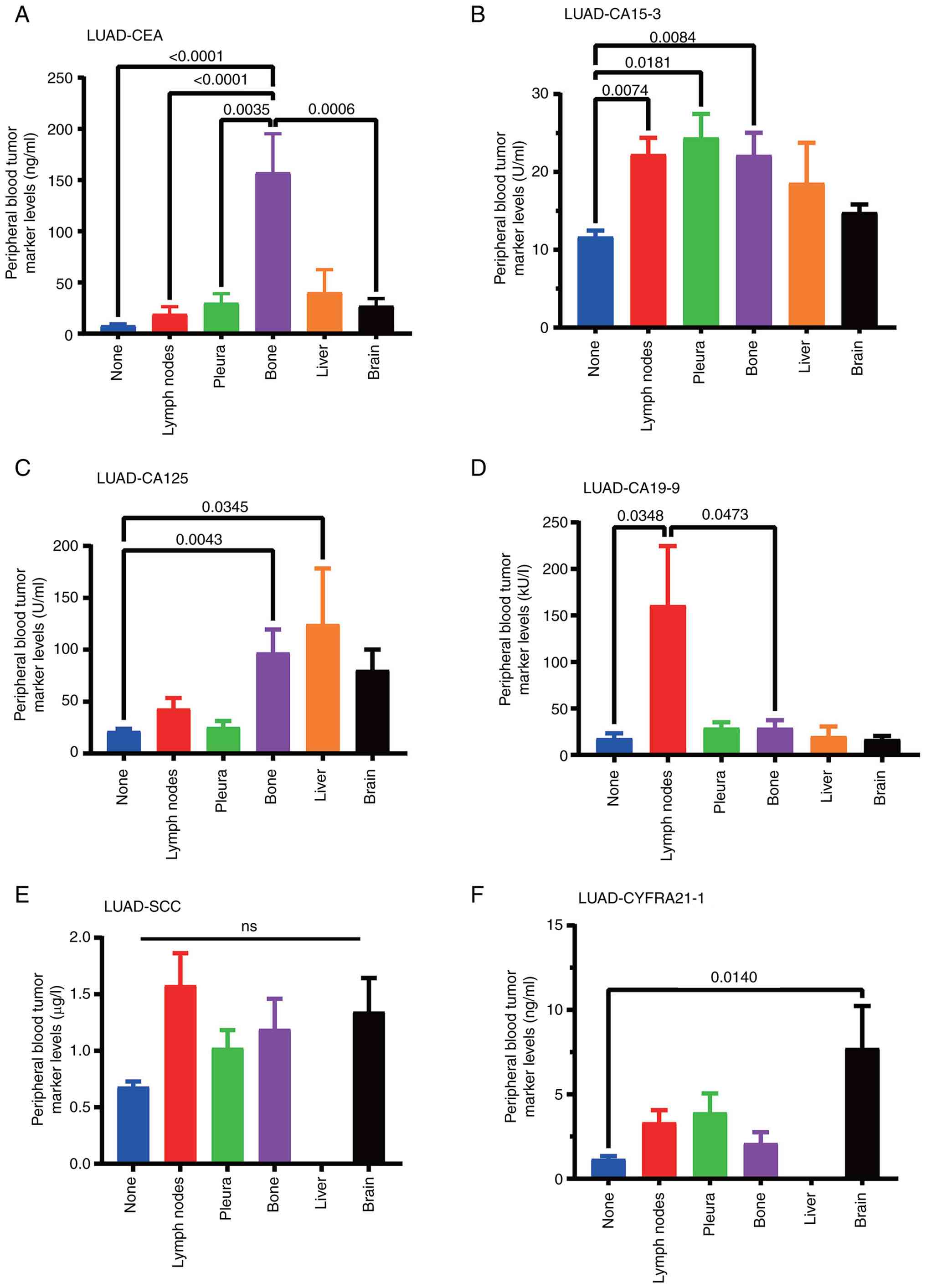 In order to present the data more intuitively, bar graphs were used and statistical analysis was performed using the data of the different groups. CEA in bone metastasis, CA19-9 in lymph node metastasis and CYFRA21-1 in brain metastasis showed strong organ specificity, while SCC content only showed a metastatic trend (Fig. 1).