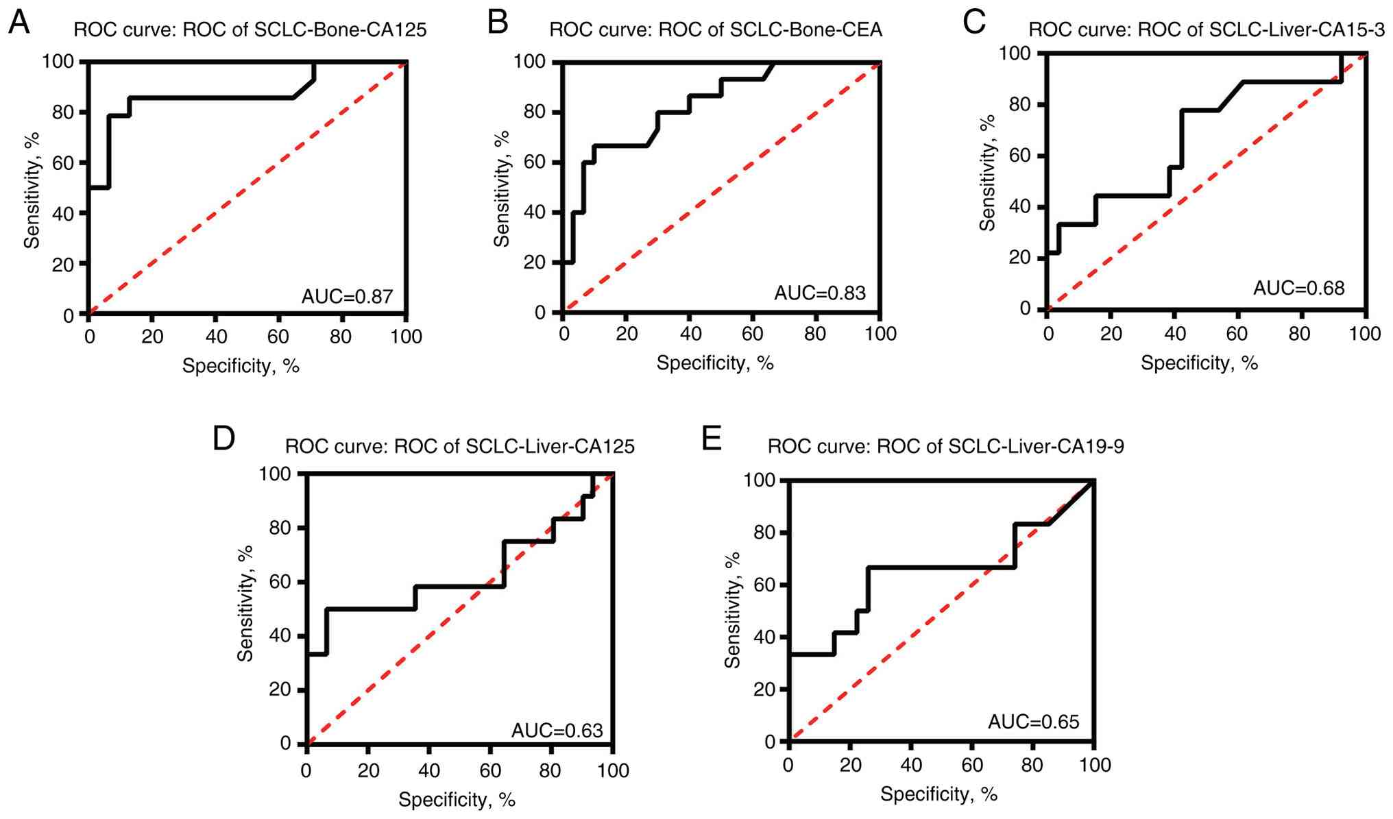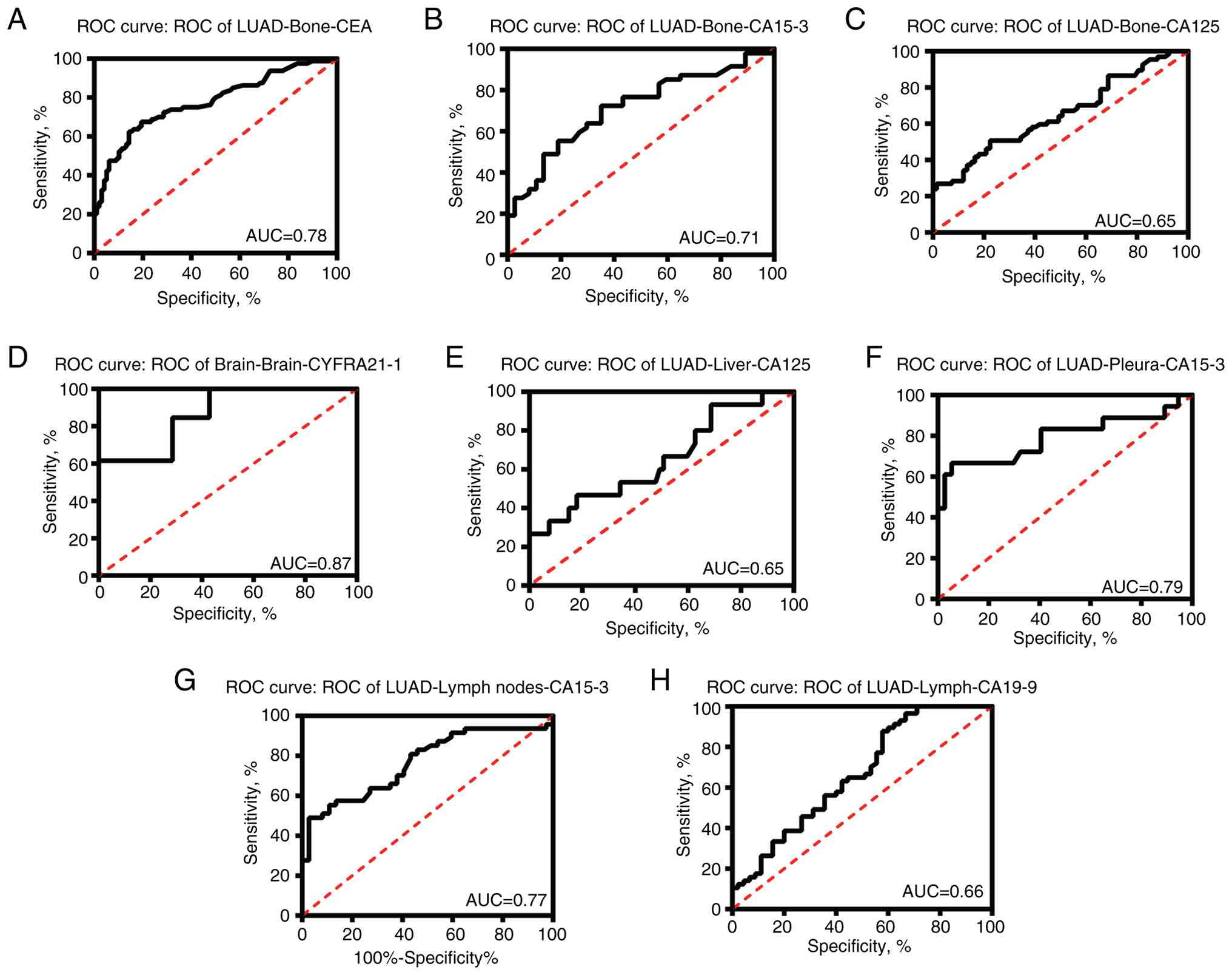 Statistical analysis was performed using SPSS (version 21; IBM Corp.). Normally distributed data are presented as the mean ± SEM and the median (interquartile range). Tumor marker concentrations between metastatic (lymph nodes, pleura, bone, liver and brain) and non-metastatic groups were compared using Student's unpaired t-test and the Mann-Whitney U test. Multiple group comparisons were performed using ANOVA and the Kruskal-Wallis test, with Tukey's post hoc test used in the event of significant results. P<0.05 was considered to indicate a statistically significant difference, and markers with significant differences in both tests were considered to have potential diagnostic value. Binary logistic regression analysis was used to evaluate the predictive probability of lung cancer metastasis by tumor markers. ROC curves were drawn using the predicted probability as a variable, and the AUC was calculated to assess the statistical significance of each marker.