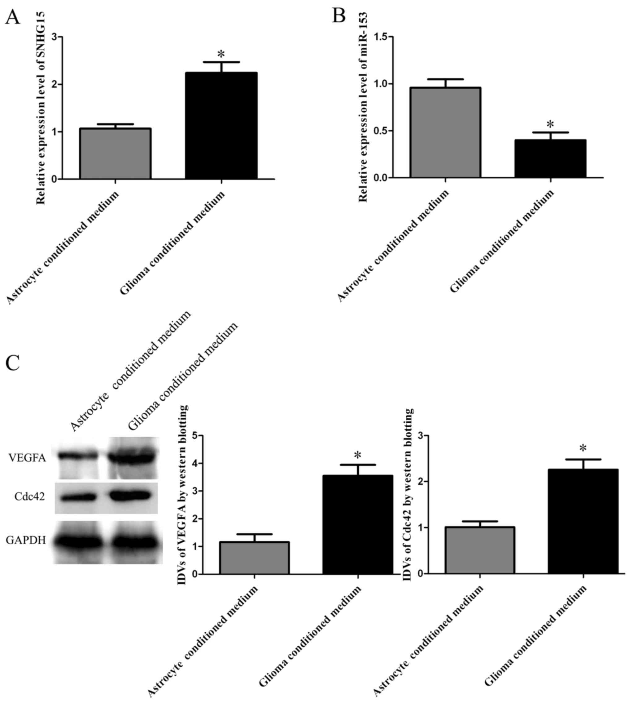 In summary, this is the first study to demonstrate that SNHG15 is highly expressed in glioma-induced endothelial cells while miR-153 is lowly expressed in glioma-induced endothelial cells. SNHG15 negatively regulates the expression of miR-153 and miR-153 negatively regulates the expression of VEGFA and Cdc42, which in turn affects glioma vascular endothelial cell proliferation, migration and tube formation in vitro. Therefore, we suggest that SNHG15 and miR-153 are novel targets for glioma anti-angiogenesis therapy.