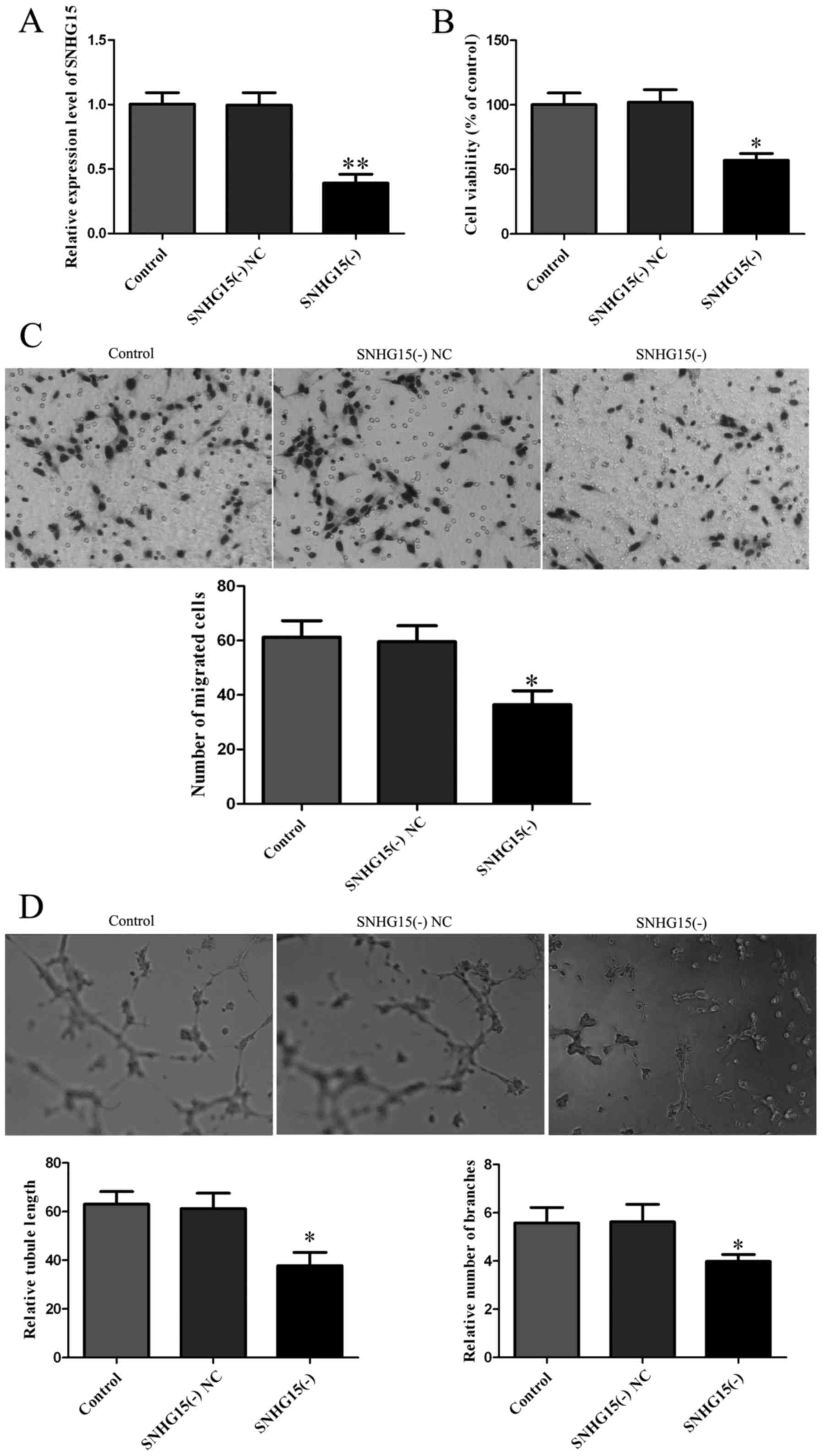 After investigation of the expression level of SNHG15 in glioma vascular ECs, we further investigated the effect of SNHG15 on proliferation, migration and tube formation of glioma vascular ECs. The stable transfected EC line with knockdown of SNHG15 was established. Expression of SNHG15 was 68.12% lower in the SNHG15(−) group than that noted in the SNHG15(−) NC group (P<0.01; Fig. 2A). Subsequently, CCK-8 assay was performed to assess the effect of SNHG15 knockdown on cell proliferation. The viability was lower in the SNHG15(−) group than that noted in the SNHG15(−) NC group (P<0.05; Fig. 2B). Cell migration assay found that compared with the SNHG15(−) NC group, the SNHG15(−) group showed a decrease in the migrated cell number (P<0.05; Fig. 2C). Results of the tube formation assay showed that relative tubule length and relative number of branches were lower in the SNHG15(−) group in contrast to these parameters in the SNHG15(−) NC group (P<0.05; Fig. 2D).