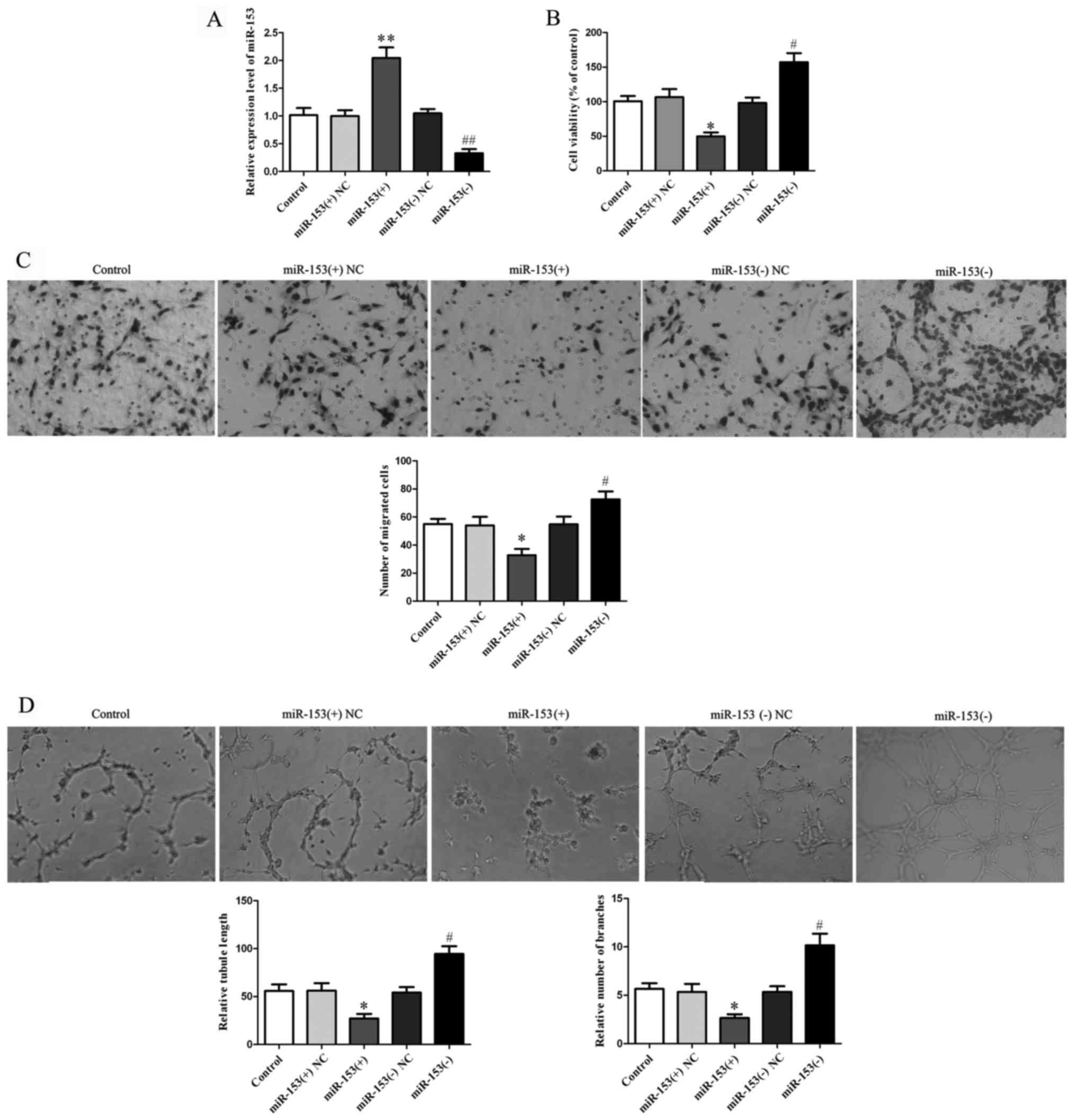 After investigation of miR-153 expression in glioma vascular ECs, we further analyzed the effect on proliferation, migration and tube formation of glioma vascular ECs. The expression of miR-153 was 110.4% higher in the miR-153(+) group than that noted in the miR-153(+) NC group and was 66.12% lower in the miR-153(−) group than that in the miR-153(−) NC group (P<0.01; Fig. 3A). CCK-8 assay found that the viability was significantly lower in the miR-153(+) group (P<0.01; Fig. 3B) and higher in the miR-153(−) group (P<0.05; Fig. 3B), in contrast to the miR-153(+) NC and miR-153(−) NC group, respectively. Cell migration assay results showed that the miR-153(+) group had a decreased migratory cell number compared with the miR-153(+) NC group while the miR-153(−) group had an increased migratory cell number compared with that noted in the miR-153(−) NC group (P<0.05; Fig. 3C). Results of the tube formation assay showed that the miR-153(+) group had a decreased relative tubule length and relative number of branches while the miR-153(−) group had enhanced tube formation in vitro (P<0.05; Fig. 3D).