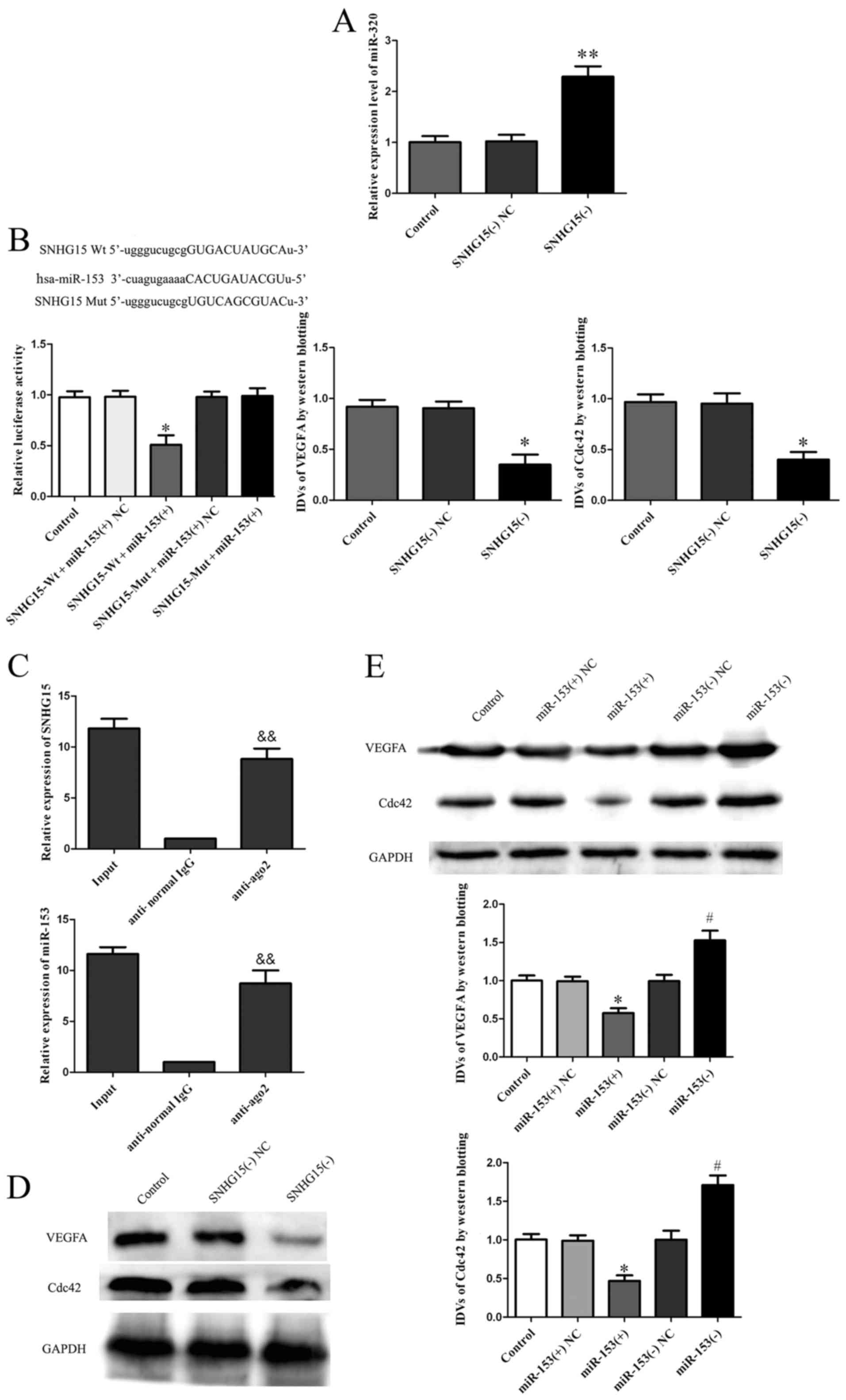 Knockdown of SNHG15 downregulates the expression of VEGFA and Cdc42 while knockdown of miR-153 upregulates the expression of VEGFA and Cdc42