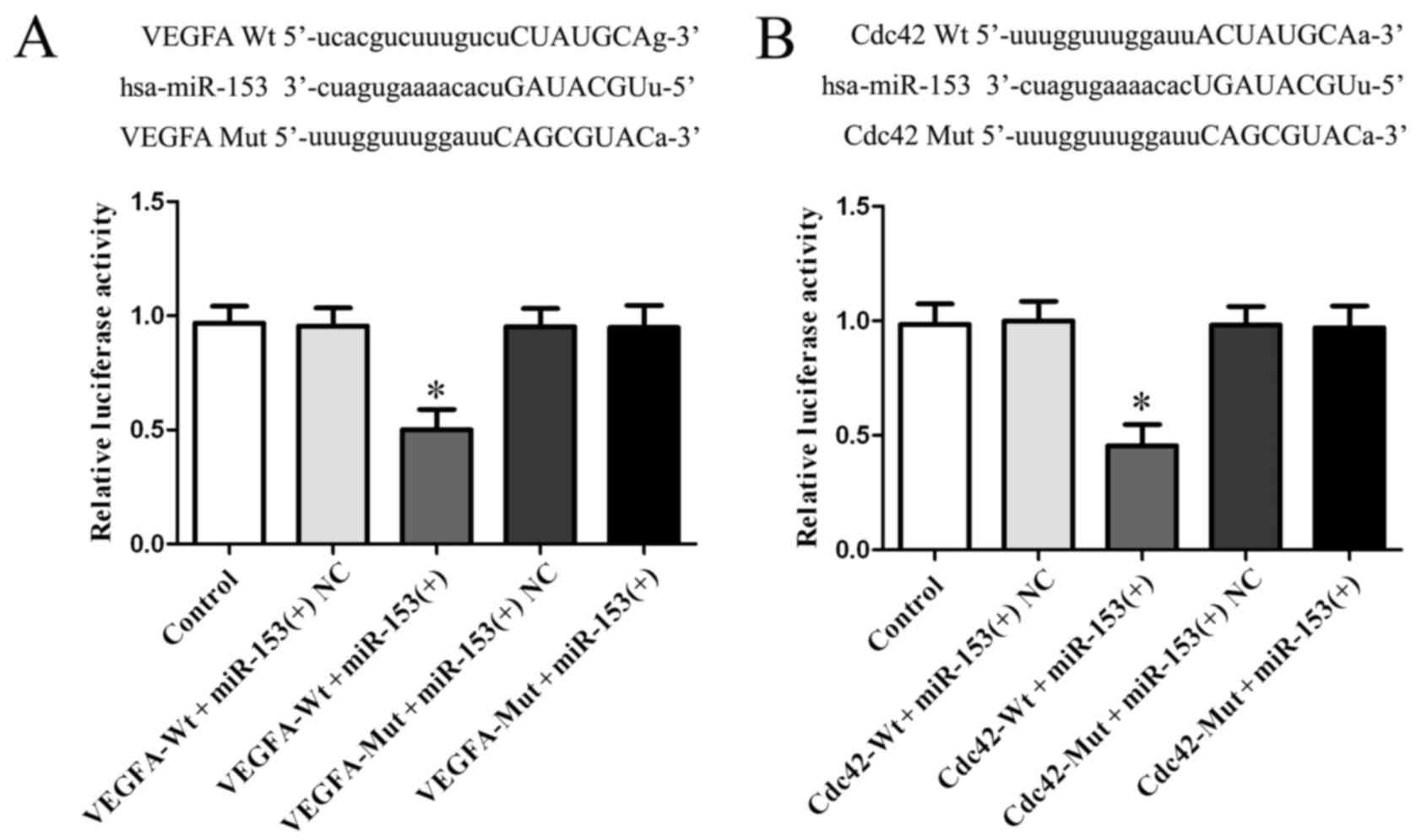 miR-153 binds to the 3′-UTR of VEGFA and Cdc42