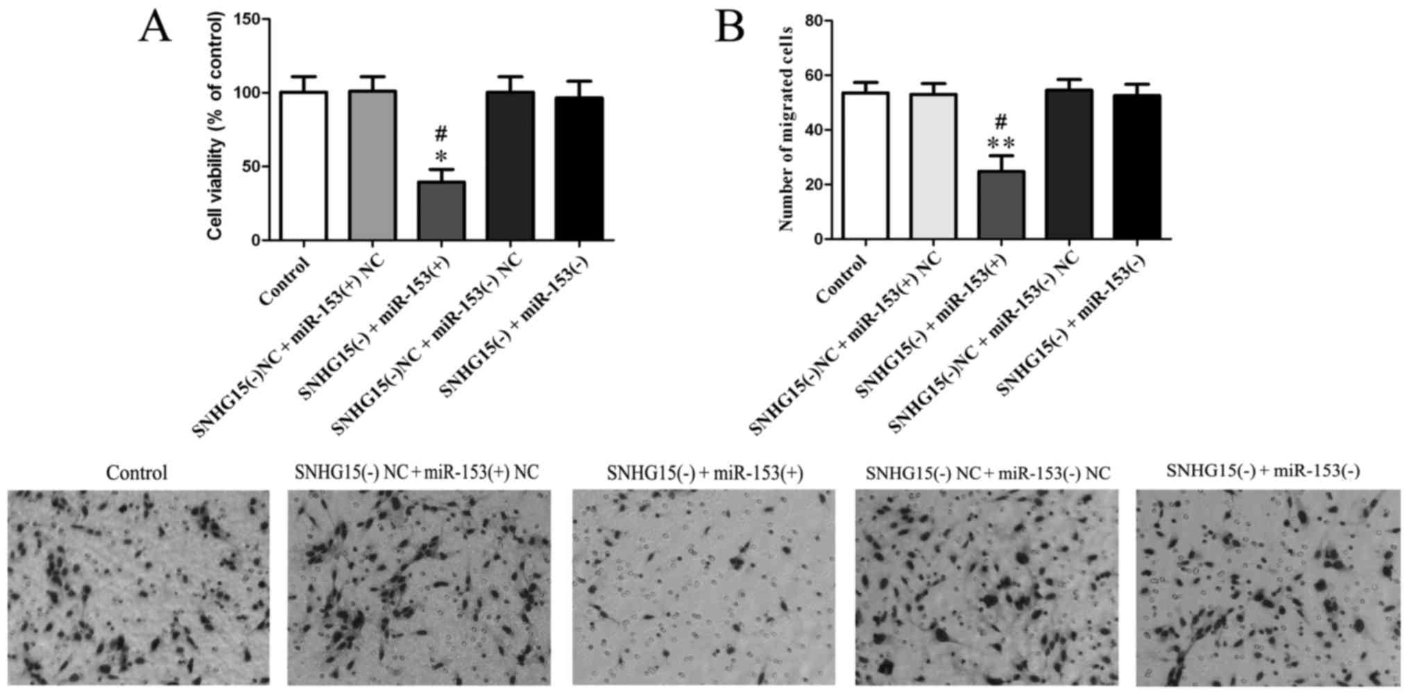 The results of the cell migration assay showed that the SNHG15(−) + miR-153(+) group had a decreased number of migrated cells compared with the SNHG15(−) + miR-153(+) NC and SNHG15(−) + miR-153(−) groups (P<0.05; Fig. 6B).
