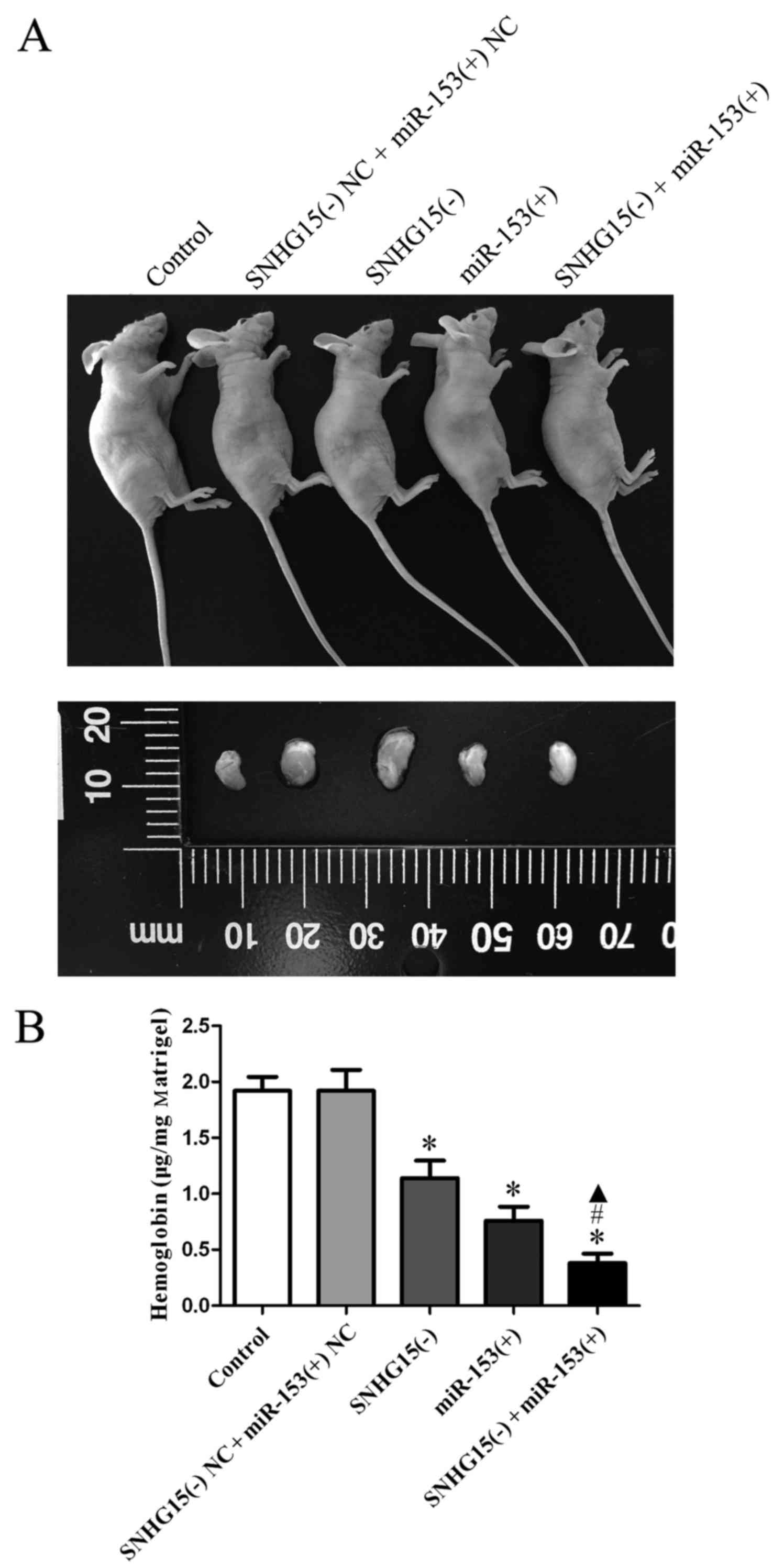 Angiogenesis was also measured by a Matrigel plug assay; the combinations of transfection were conducted prior to the assessment of angiogenesis. The results revealed that the amount of hemoglobin in the SNHG15(−), miR-153(+) and SNHG15(−) + miR-153(+) groups was significantly decreased compared with that in the SNHG15(−) NC + miR-153(+) NC group, and the amount of hemoglobin in the SNHG15(−) + miR-153(+) group was found to be the least among all the groups (P<0.05; Fig. 7B).