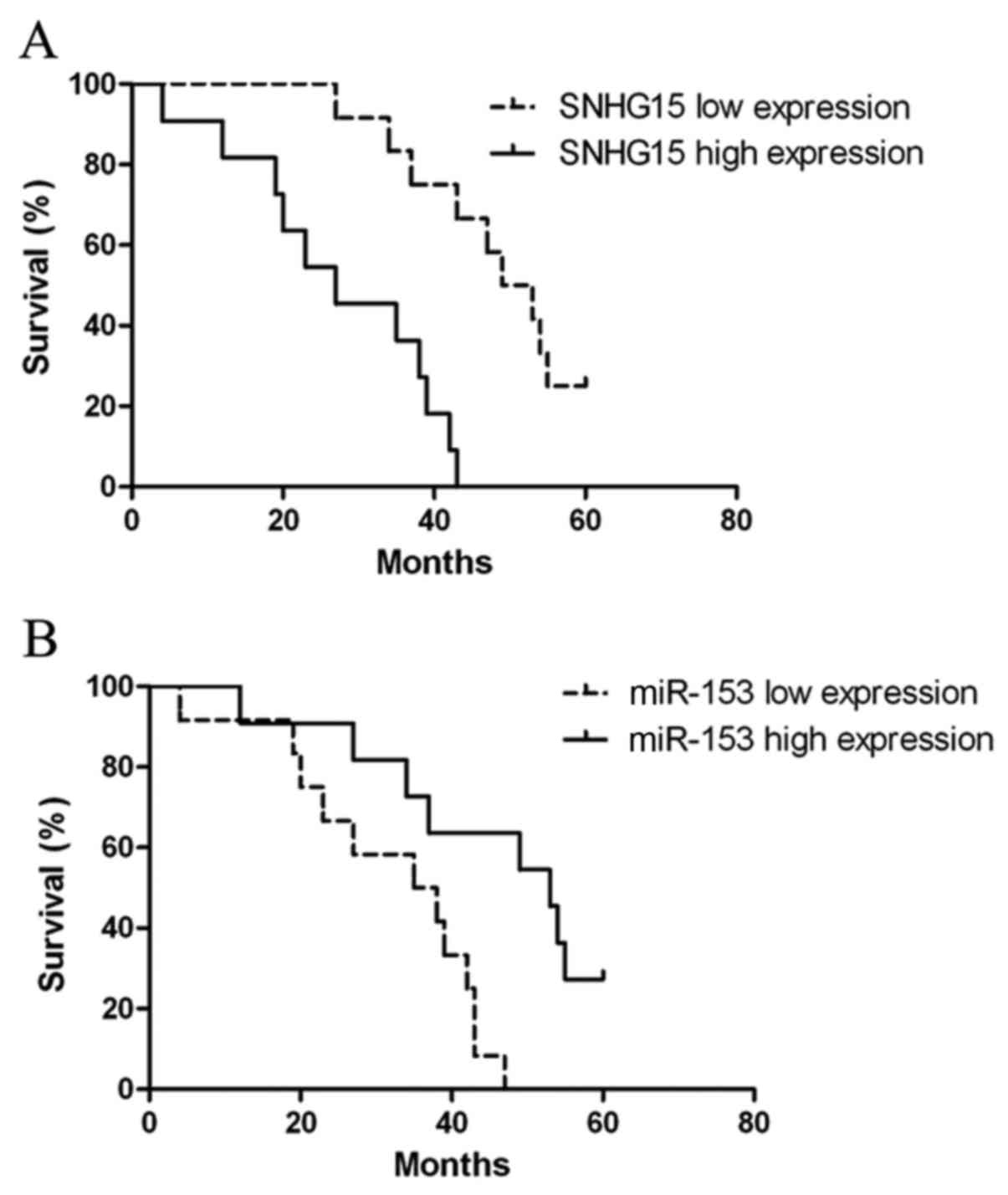 Association of SNHG15 and miR-153 expression with the survival of glioma patients